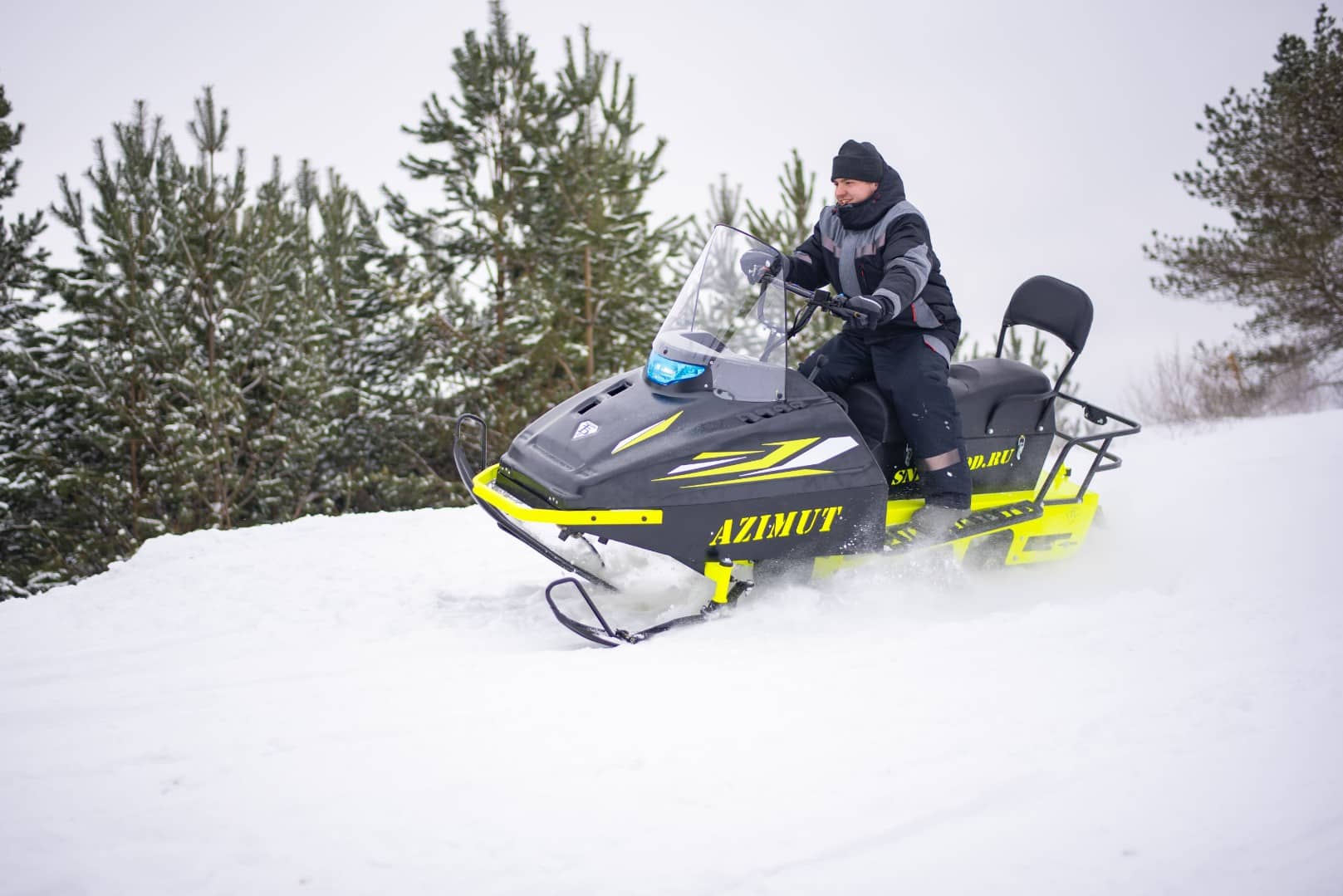 «Азимут CS» также имеет классическую снегоходную компоновку с передним расположением двигателя. Он надежен, прост в обслуживании и ремонтопригоден, обладает хорошими тяговыми характеристиками и показателями проходимости.
