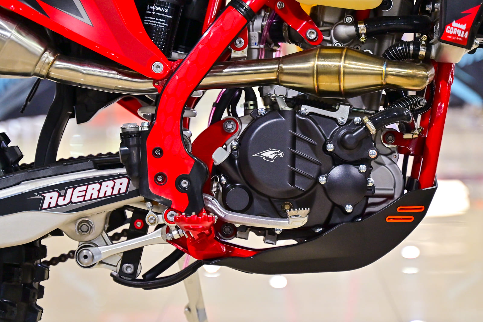 Защиты: В наличии радиаторов, двигателя и рамы, что увеличивает безопасность и защищает важные узлы мотоцикла при езде по сложным трассам.