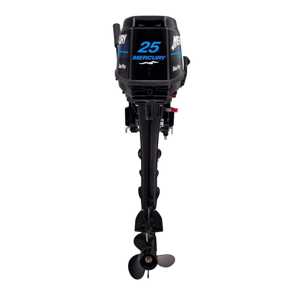 Мотор серии Sea Pro — выносливый, мощный и неприхотливый. Фактически мотор Меркури 25 Sea Pro, аналог мотора Меркури 30, дефорсирован путем установки прокладки в карбюраторе. Смысл дефорсирования — работа мотора на максимальных оборотах становится намного экономичнее в плане топлива и существенно увеличивается ресурс мотора. Его можно использовать как для повседневной жизни — отдыха, рыбалки, так и в коммерческом использовании, в тяжелых условиях работы. Mercury 25 Sea Pro имеет классическую систему управления — газ на румпеле, переключение передач на корпусе мотора. Он легко переделывается в дистанционный вариант и имеет в дополнительном оборудовании возможность установить выпрямитель и запитать бортовую систему лодки или катера от работающего двигателя.