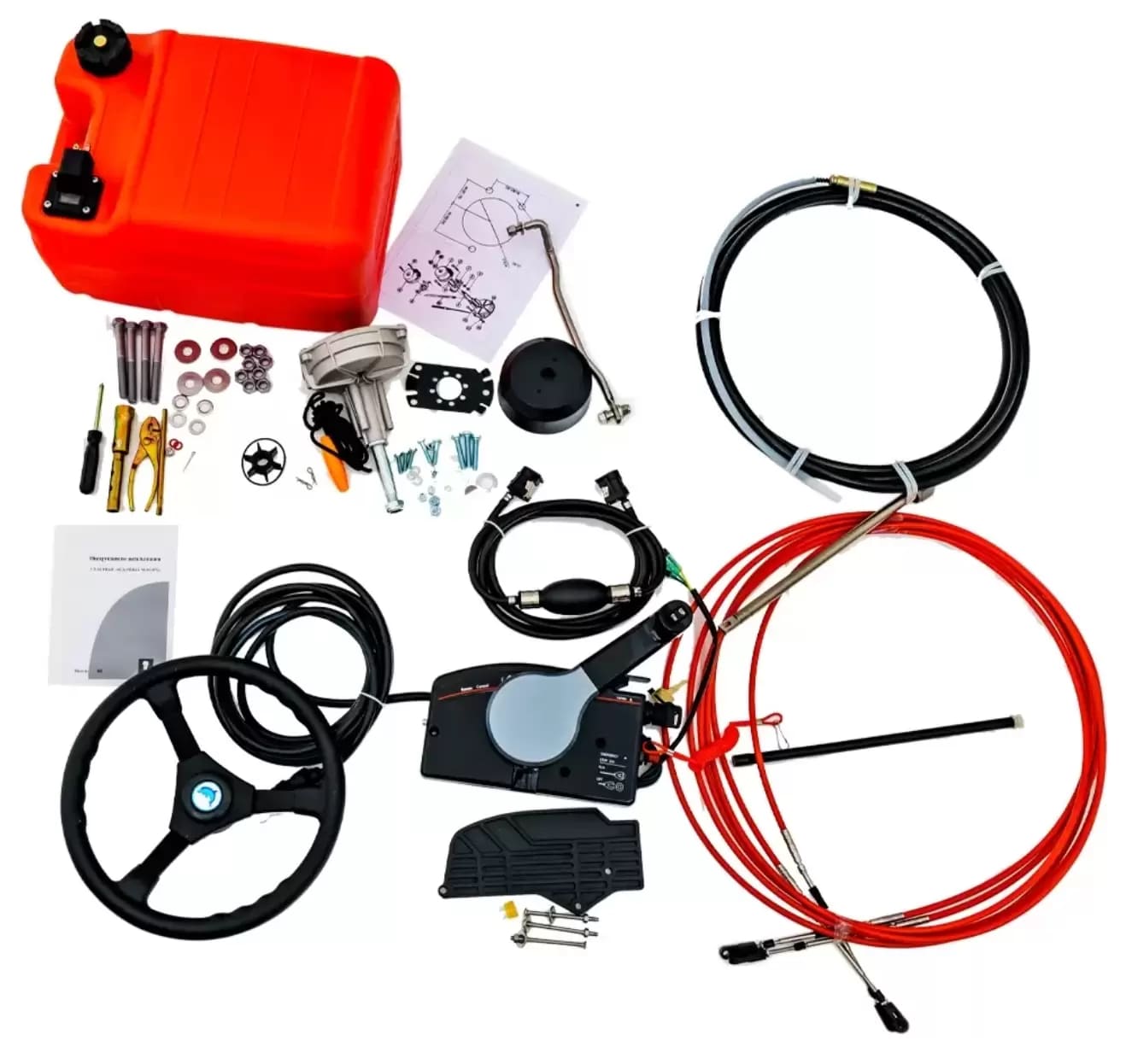 Двигатель поставляется с рулевым колесом, рулевым редуктором и тягой, рулевым тросом М66 3,8 метра (13FT), тросами газа/реверса C-2 3,8 метра (13FT), контроллер газа реверса 703 (7pin) с возможностью управления электроподсосом с замка зажигания, реле зарядки АКБ, чекой безопасности и запасной крыльчаткой охлаждения. Двигатель приводится в рабочий режим электростартером, также доступен ручной запуск. Быстрый запуск создает встроенная система электронного зажигания CDI. Управление происходит с помощью дистанционной системы.