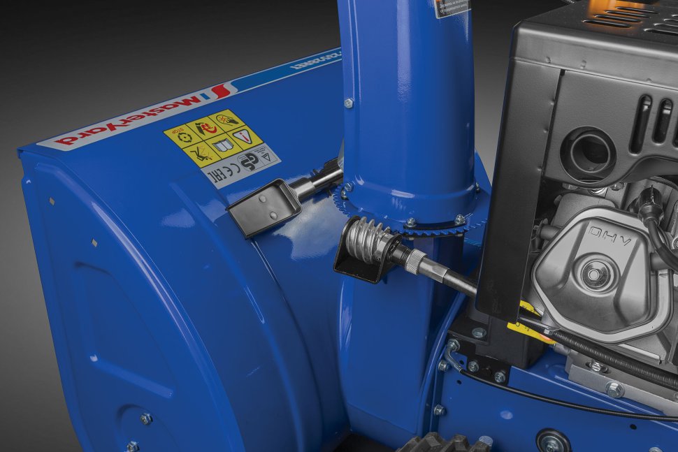 — металлический желоб выброса с системой быстрого разворота меняет направление выброса снега на 190 градусов;