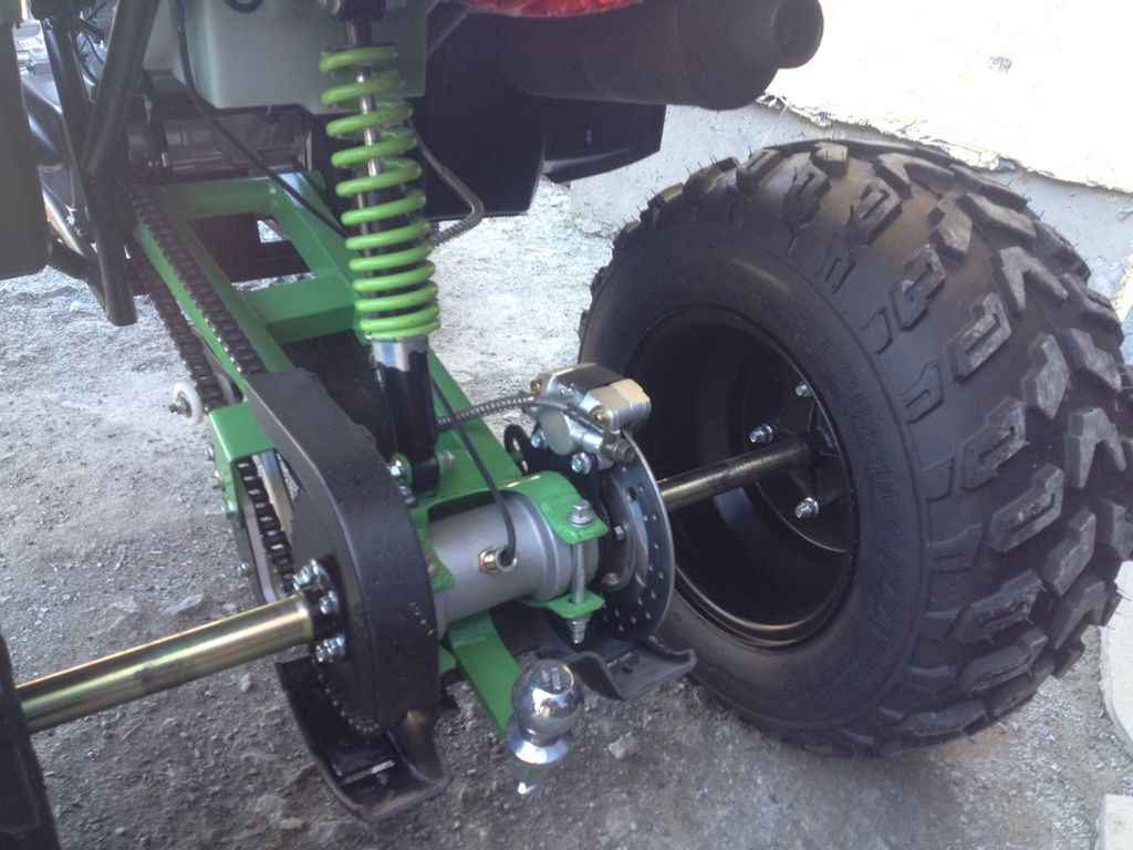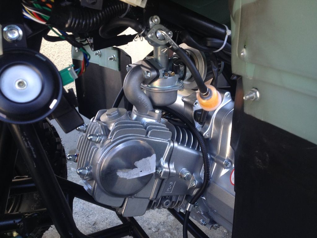 Квадроцикл оснащен бензиновым двигателем мощностью 10 л.с. и объемом 125 кубов с воздушным охлаждением. Запуск двигателя возможен электростартером от аккумулятора. Цепь приводит в движение заднюю ось и выдерживает большие нагрузки. Квадроцикл также оснащен топливным баком 4 литра, который позволяет без перерыва активно кататься в течение 1-го часа или даже больше, в зависимости от скорости и условий.