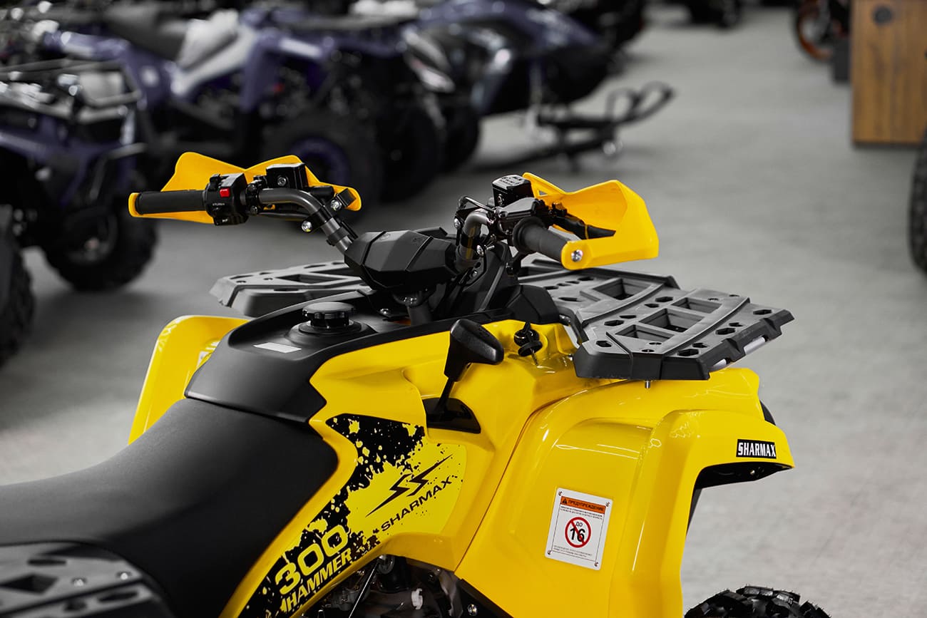 SHARMAX 300 HUMMER — это многофункциональный квадроцикл, который показывает безотказную работу во время активного отдыха. Квадроцикл оборудуется одноцилиндровым четырехтактным двигателем с принудительно воздушно-масляным охлаждением. Рабочий объем силовой установки составляет 200 см3, мощность — 23 л. с. Квадроцикл с отличными рабочими показателями, высоким качеством сборки, прочной конструкцией и минимальными затратами на обслуживание. Качество сборки этой модели неоспоримо, что подтверждают различные государственные и международные сертификаты качества в том числе ISO 9001. Широкая колесная база и довольно высокий дорожный просвет обеспечивает квадроциклу максимальную устойчивость и управляемость даже при самых крутых поворотах на высокой скорости, что делает этот аппарат незаменимым для поездок по пересеченной местности и бездорожью, с максимальным зарядом позитива.