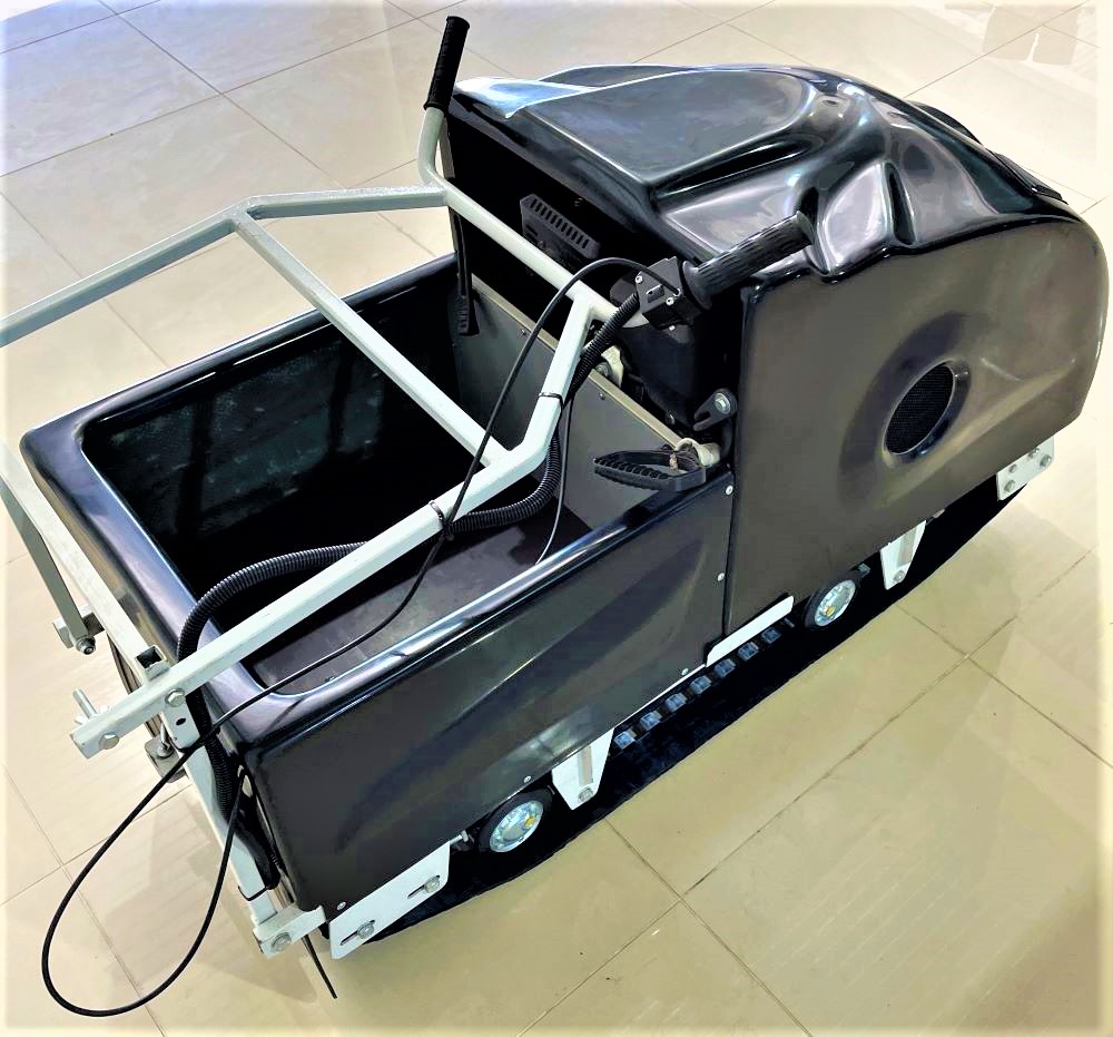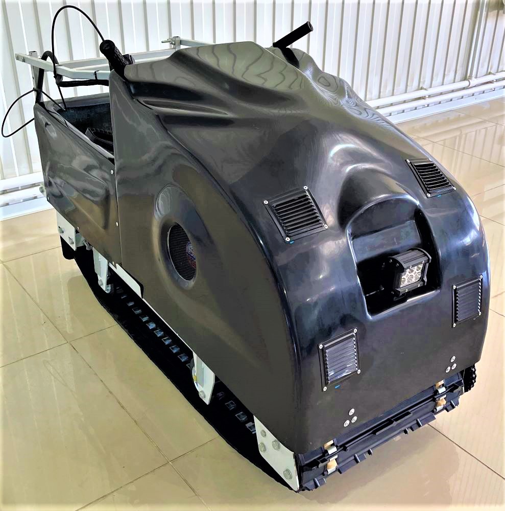 Мотособака весит 110 кг, а размер ее составляет 137 см в длину, 60 см в ширину и 81 см в высоту. Модель оснащена гусеницей шириной 500 мм. Гусеница в сочетании с катковой подвеской способна проходить спокойно по льду и даже по территории без снега.