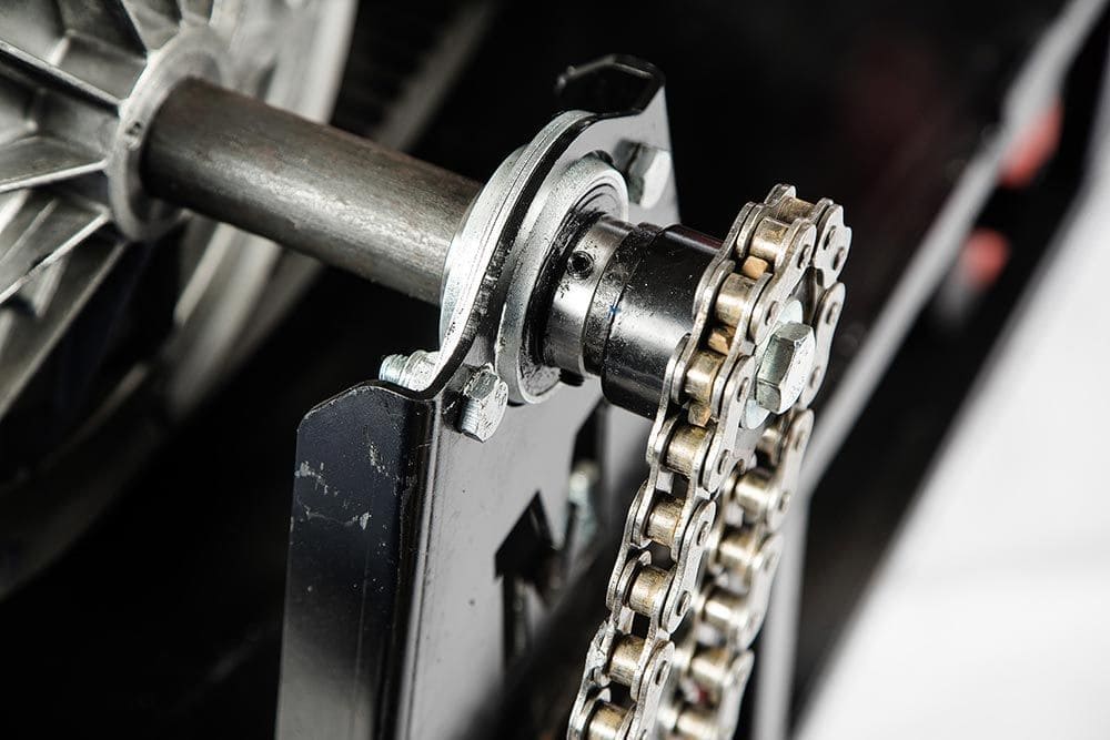 Увеличенный угол атаки позволяет с легкостью преодолевать глубокие снежные заносы. На ведущем валу мотобуксировщика установлены самоцентрующие подшипники. Смазка подшипника производиться без разборки ведущего вала и снят. Крепление руля вынесено выше платформы, что значительно повышает управляемость мотобуксировщика. Ширина руля средняя, что облегчает управление мотобуксировщиком в болоте и лесу. На мотобуксировщике установлен фаркоп. Это упрощает процесс крепления саней к мотобуксировщику, в отличии от стандартных прицепных устройств, где используется обычный рымбол.