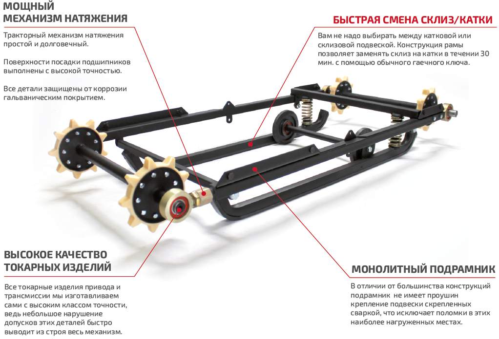- Двигатель расположен сзади для улучшения межосевой развесовке и равномерного распределения удельного давления на грунт. Эта особенность, в том числе, повышает устойчивость и сводит к минимуму риск переворачивания мотобуксировщика;