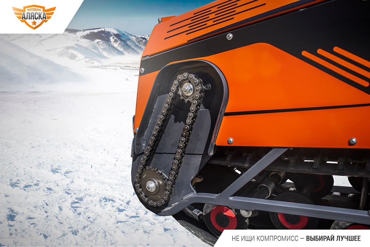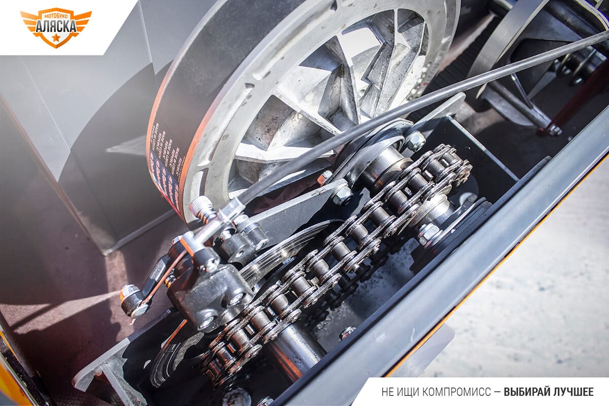Мотособака имеет усиленную рамную конструкцию из гнутого профиля и стальной окрашенный кузов, нанесенный на заводе. Производитель также предусмотрел защиту приводной цепи и деталей подвески, дисковый тормоз с функцией парковки, магнето-генератор для электрооборудования и зарядки мобильных устройств. Благодаря хорошей тяге, мягкой подвеске, а также оптимальной компоновке узлов и угла атаки гусеницы, мотобукс обеспечивает комфортное движение по бездорожью.