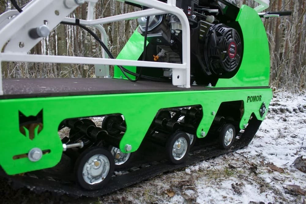Мотобуксировщик Pomor X-500 оснащен мощным бензиновым двигателем с воздушным охлаждением, который обладает мощностью 18 л.с. и объемом 459 см³. Эта надежная силовая установка обеспечивает отличную производительность и экономичность, что позволяет использовать устройство в различных условиях. Двигатель легко запускается благодаря ручному стартеру и обеспечивает стабильную работу даже при низких температурах, что делает его идеальным для зимних поездок.