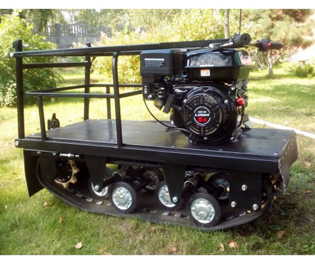 На буксировщике установлен двигатель марки Lifan (Лифан) мощностью 8 лошадиных сил, подвеска буксировщика катковая (катки и валы Буран).
