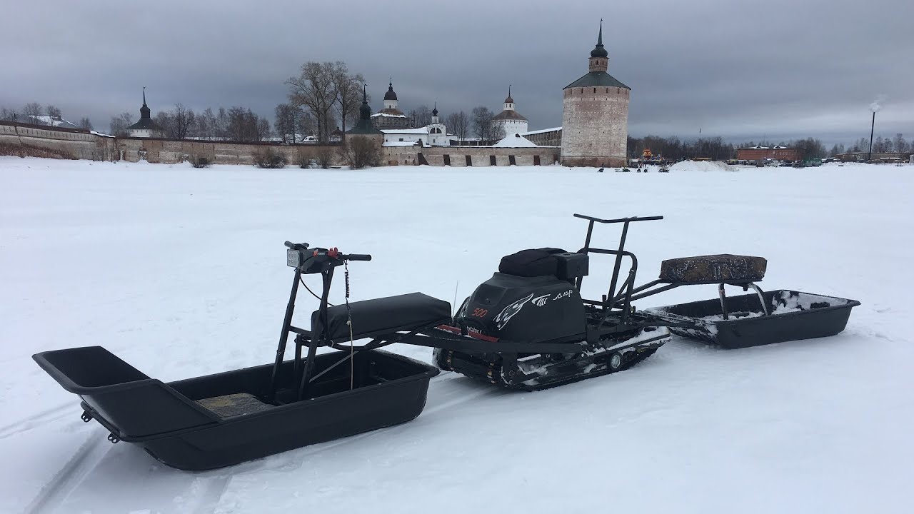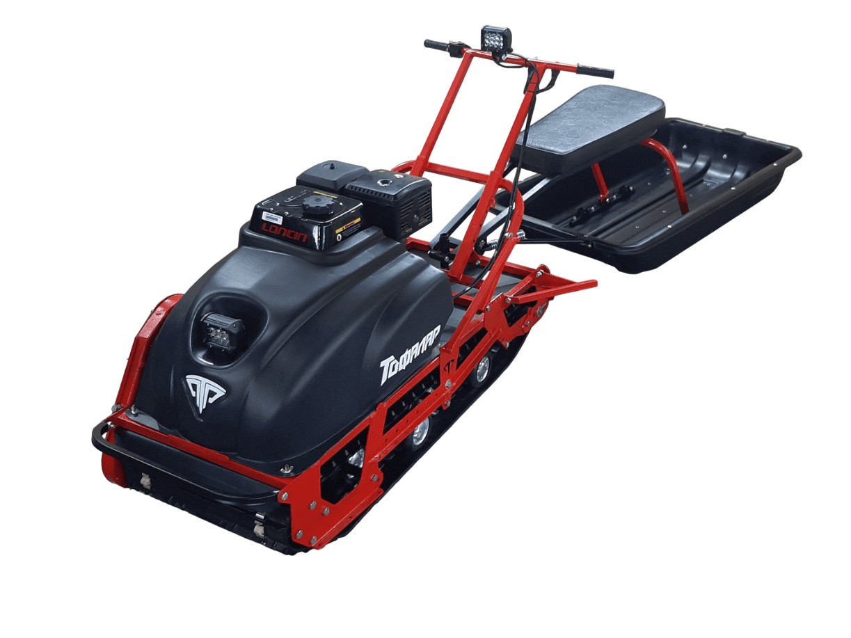 В конструкции мотовездехода используется цельная резиновая гусеница шириной 500 мм. Гусеница в сочетании с катковой подвеской способна проходить спокойно по льду и даже по территории без снега.