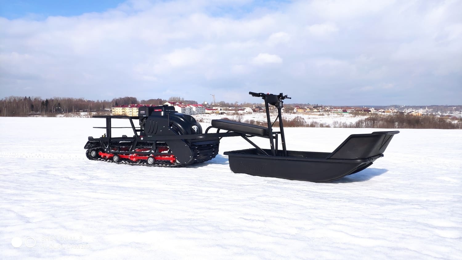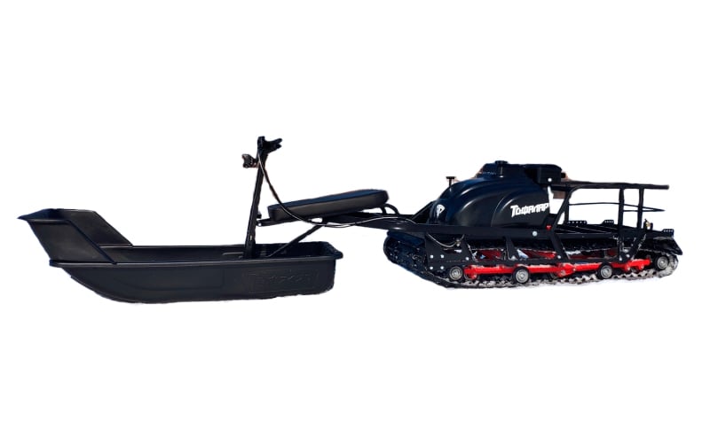 В конструкции мотовездехода используется цельная резиновая гусеница шириной 600 мм. Гусеница в сочетании с катковой подвеской способна проходить спокойно по льду и даже по территории без снега. Увеличенная площадь опоры гусеницы улучшает тяговые характеристики, проходимость и устойчивость буксировщика.