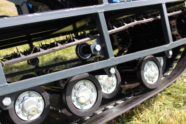 На мотобуксе установлена катковая подвеска. Катки устанавливаются на оси и предназначены для смягчения ударов и вибраций, возникающих при движении по неровной местности. Подвеска также способствует лучшей проходимости и устойчивости мотобуксировщика, обеспечивая более комфортное и безопасное передвижение как в сельской местности, так и на дорогах.