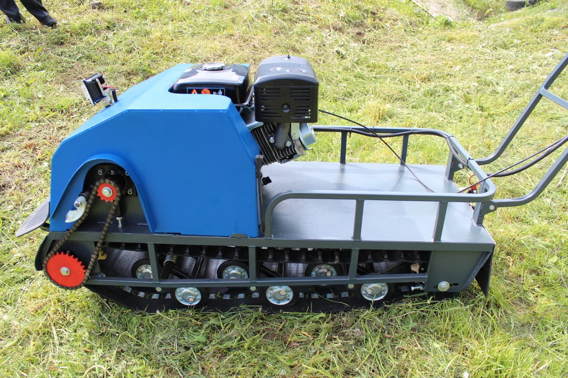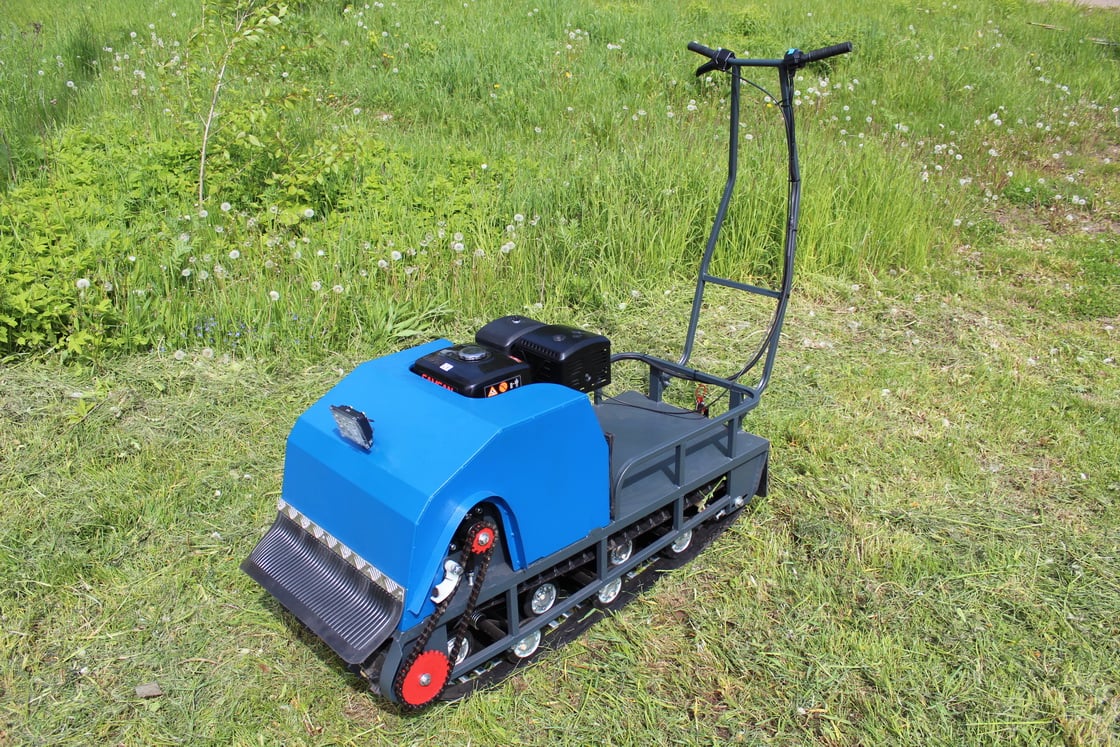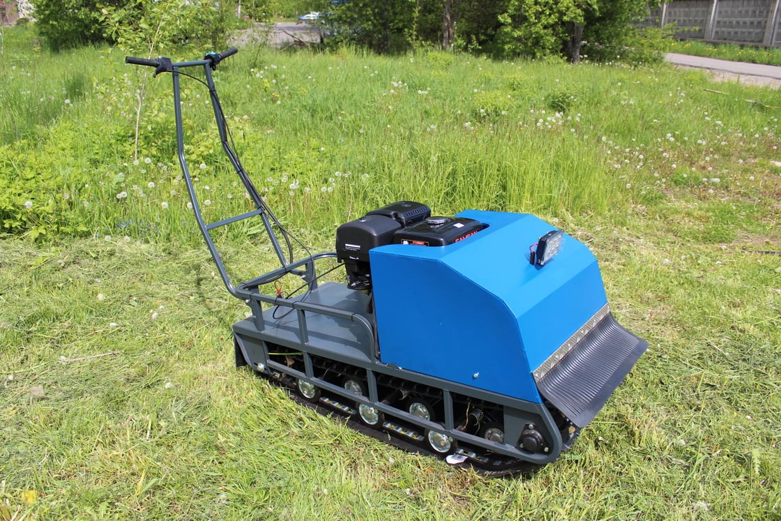 На мотобуксе установлена катковая подвеска. Катки устанавливаются на оси и предназначены для смягчения ударов и вибраций, возникающих при движении по неровной местности. Подвеска также способствует лучшей проходимости и устойчивости мотобуксировщика, обеспечивая более комфортное и безопасное передвижение как в сельской местности, так и на дорогах.
