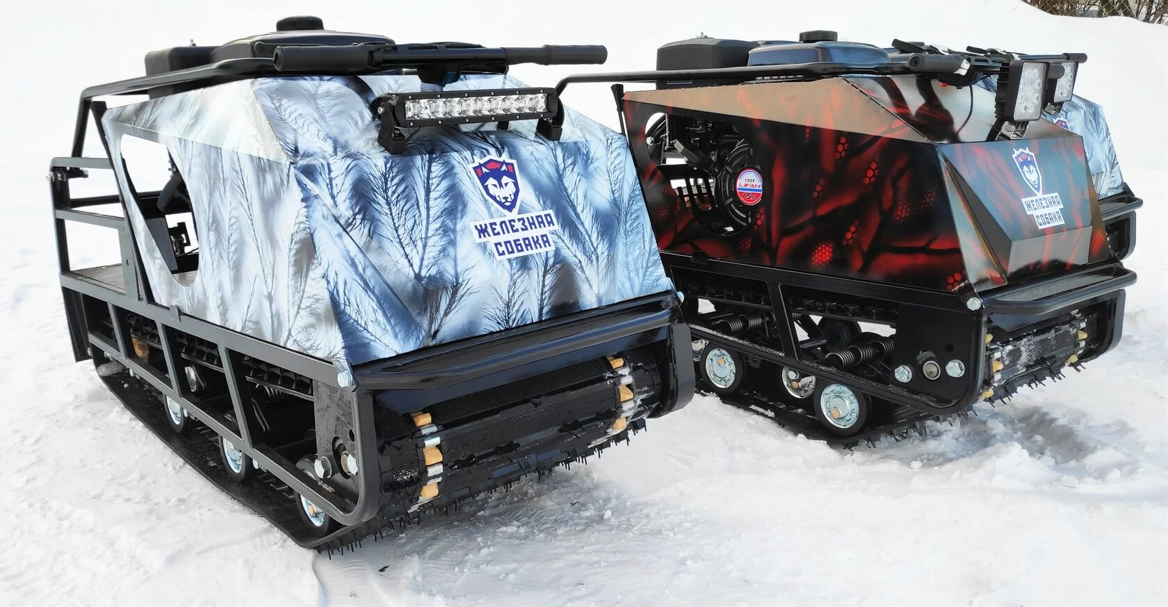 Мотособака весит 120 кг, а размер ее составляет 125 см в длину, 50 см в ширину и 74 см в высоту. Модель оснащена гусеницей шириной 500 мм. Гусеница в сочетании с катковой подвеской способна проходить спокойно по льду и даже по территории без снега.