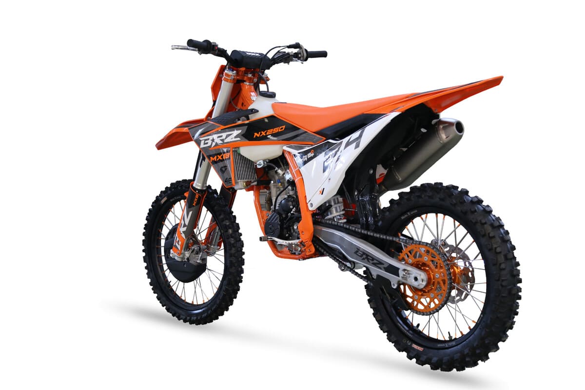 BRZMX8 NX250 24 очень легкий и мощный, для эффективного торможения установлены новые тормоза — спереди двухпоршневые, сзади одно поршневые, передний тормозной диск 260 мм и 220 мм задний. Кантри-кросс, эндуро и даже мотокросс — BRZ MX8 NX250 24 одинаково уверенно себя чувствует в любой дисциплине