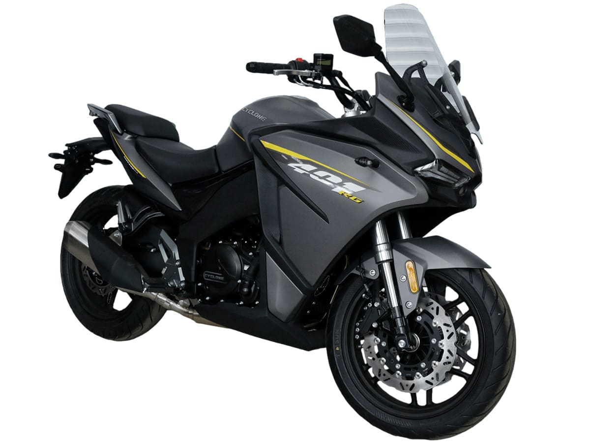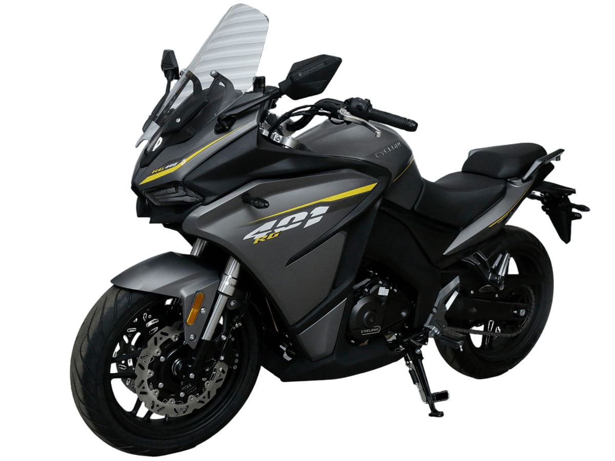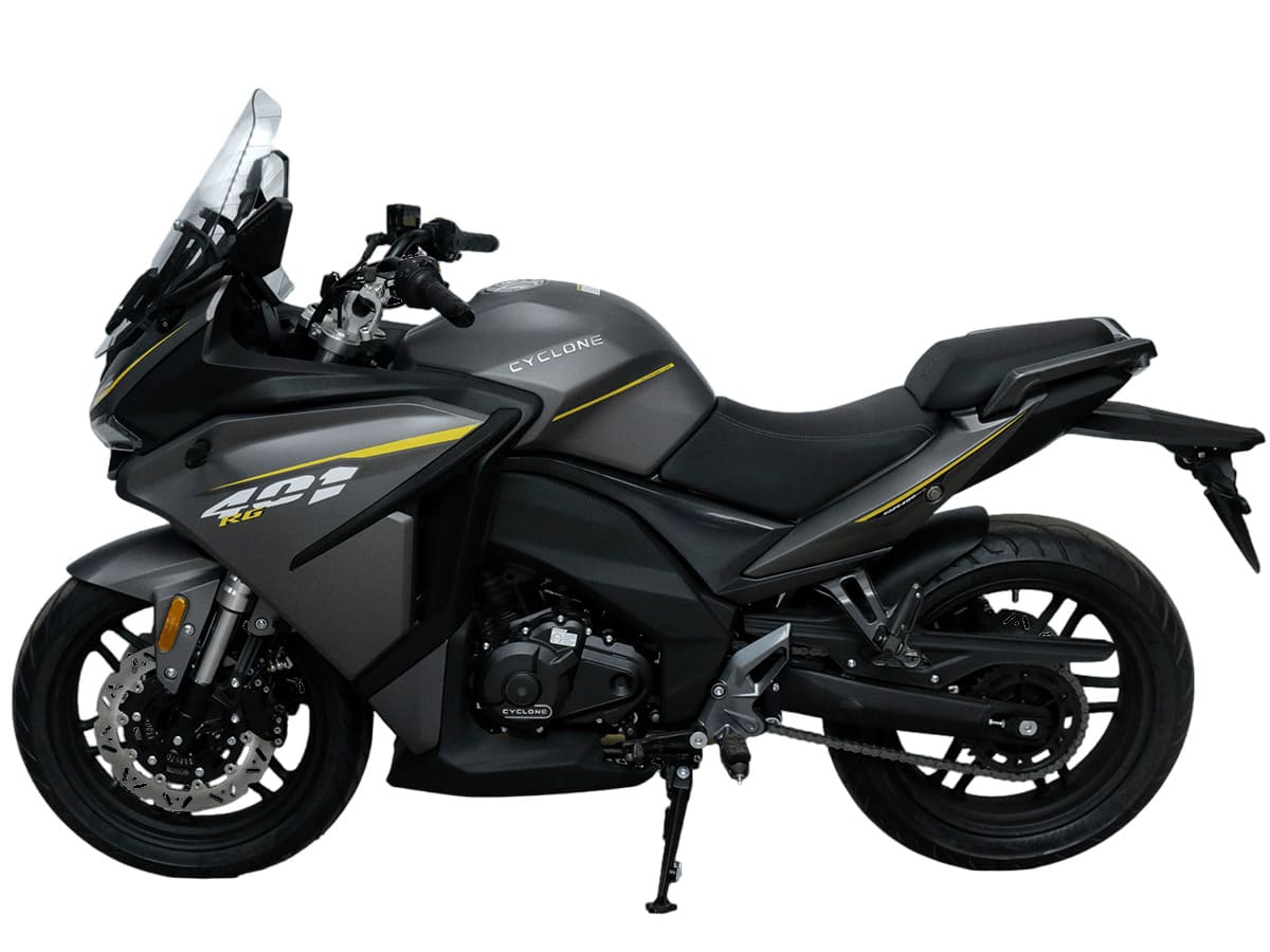 CYCLONE RG401 (SR400GS-B) – турист для покорения самых непростых и протяжённых маршрутов. Он обладает стремительным и современным дизайном в лучших “традициях жанра” туристических мотоциклов. В качестве силовой установки выступает рядный двухцилиндровый четырёхтактный двигатель объёмом 401 см3 , который выдаёт 45 л.с. на 9500 об/мин. Максимальный крутящий момент достигается на 8000 об/мин и составляет 37 Н·м. Инжекторный впрыск топлива с блоком управления BOSCH увеличивает топливную экономичность, а также позволяет добиться высокой приёмистости и неприхотливости агрегата. Жидкостная система охлаждения не допустит перегрева двигателя даже на самых непростых маршрутах. На мотоцикл установлена 6-ступенчатая механическая коробка передач. Максимальная скорость мотоцикла составляет 155 км/ч.