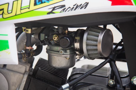 Весом всего 65 кг, передние шины на 12 дюймов, задние на 10, спицованные колесные диски, автоматическое сцепление с четырьмя скоростями, гидравлическая тормозная система, маятниковая подвеска, карбюратор Jink Ke 22мм с обогатителем, короткоходная ручка газа, датчик моточасов, подножки для водителя, запуск двигателя возможен как с электростратера, так и с кик, защитная экипировка яркого цвета делает эту модель привлекательной и достойной внимания.