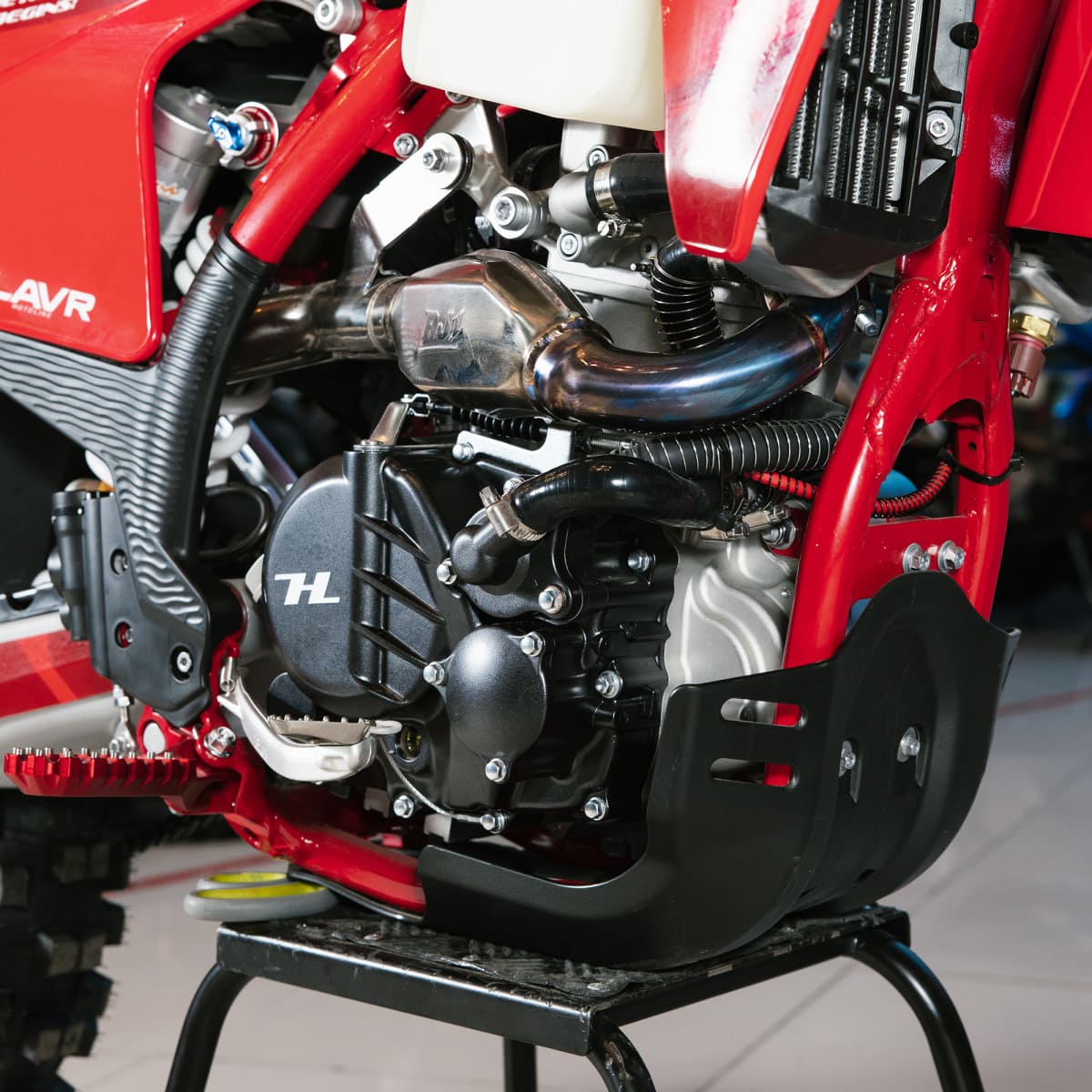 Пластик выполнен в стиле GASGAS 2024 года, что подчёркивает спортивный характер байка. Выхлопная система с титановой трубой глушителя снижает вес и улучшает терморежим. Руль из алюминиевого сплава 7075 усиленного типа, новые широкие пеги AJ1, грипсы AJ1 Lock On и антискользящее сиденье AJ1 обеспечивают комфорт и полный контроль в любой ситуации.