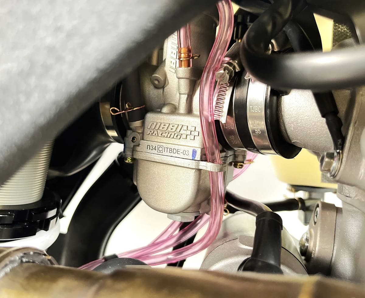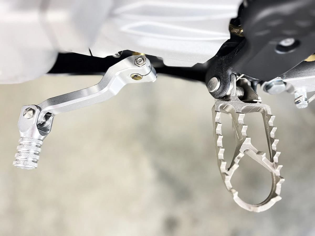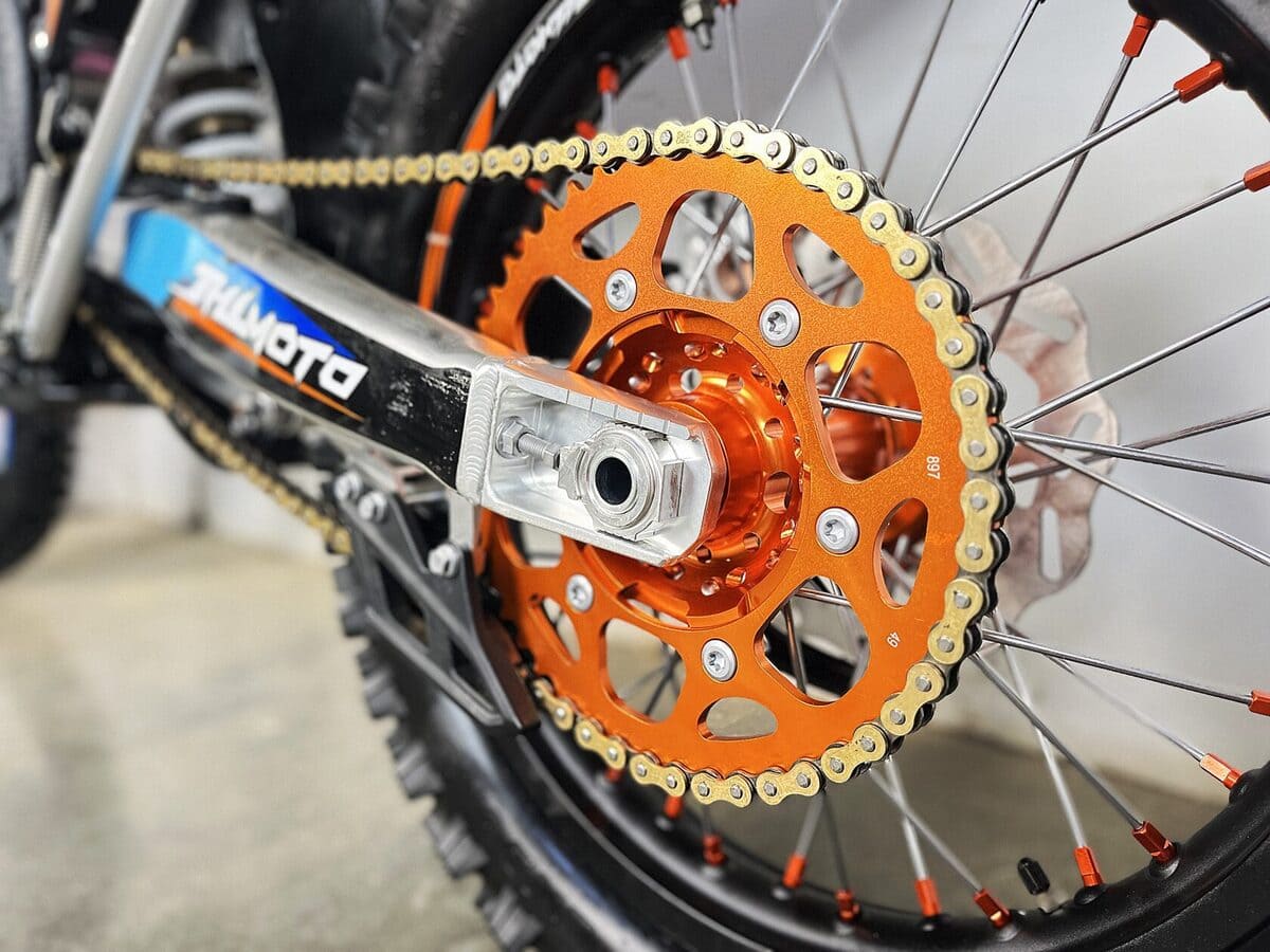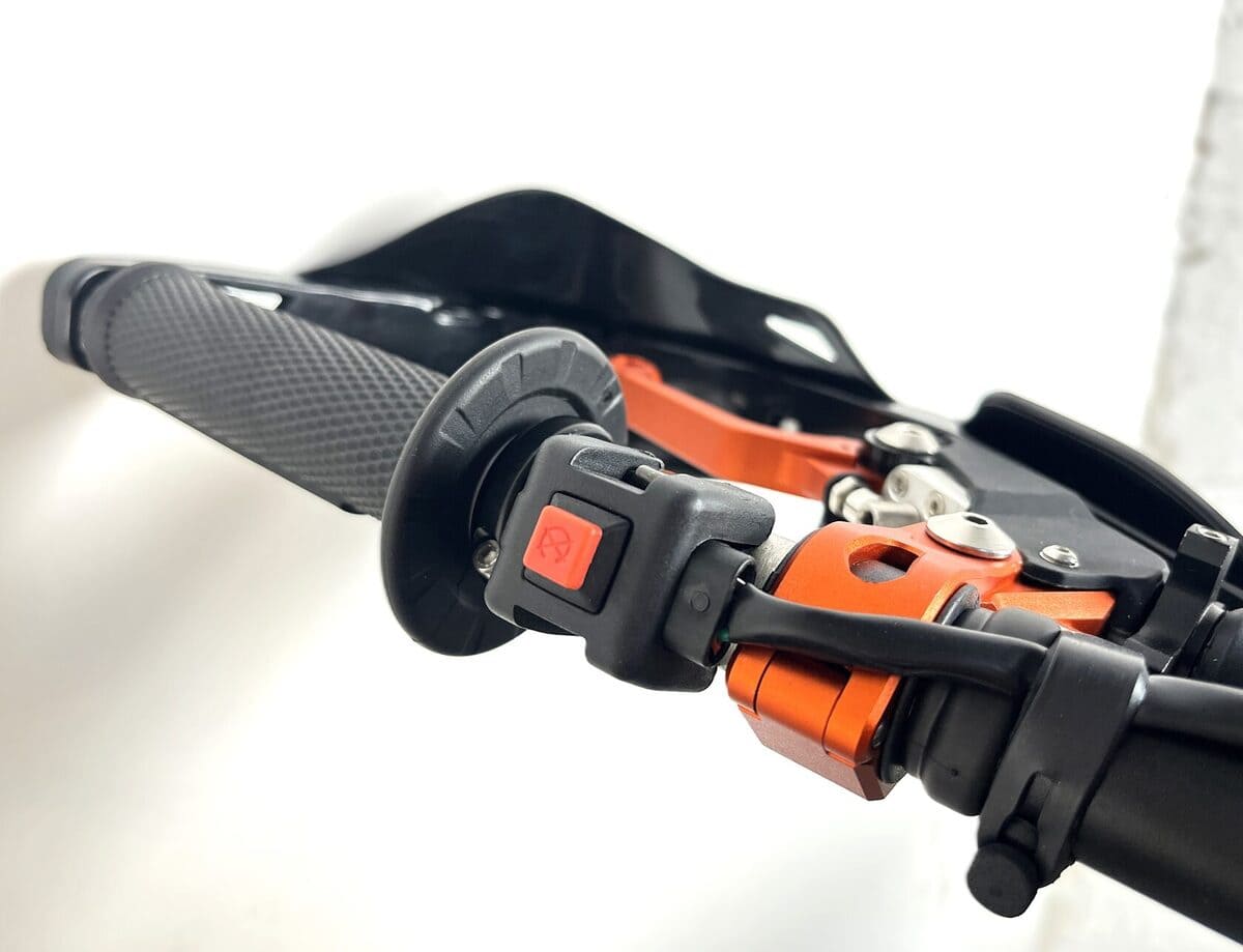 Пластик используется KTM2020 – очень прочный и распространенный, что делает его максимально возможным к обслуживанию. Руль IGP TwinWall 22/28 алюминиевый на всех моделях! Силиконовые грипсы Nibbi Racing – левая на замке, правая на короткоходной ручке газа Nibbi. Рычаги тормоза/сцепления – неломайки, из фрезерованного алюминия от CNC. Влагозащищенные кнопки старт/стоп на руле. Складной рычаг переключения передач, фрезерованный, из алюминия, от бренда PRO CAKEN. Лапка тормоза так же фрезерованная, алюминиевая. Самая легкая и прочная приводная цепь RK520MXZ уже установлена!