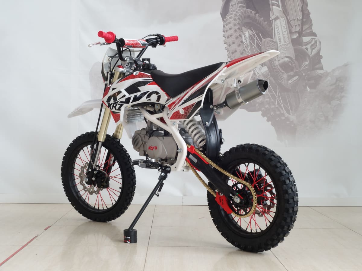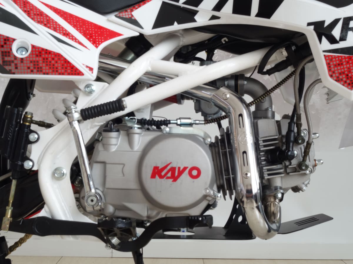 В прочной стальной раме испытанной конструкции стоит одноцилиндровый 4-тактный двигатель YX1P56FMJ с воздушно-масляным охлаждением и коробкой скоростей на четыре передачи. Базовая производительность этого 140-кубового мотора вполне устроит тех райдеров, которым уже не достаточно стартового 125 см3 рабочего объема двигателя. А заявленной компанией Kayo максимальной развиваемой двигателем мощности свыше 11 лошадей будет достаточно для большинства вариантов использования питбайка на бездорожье.