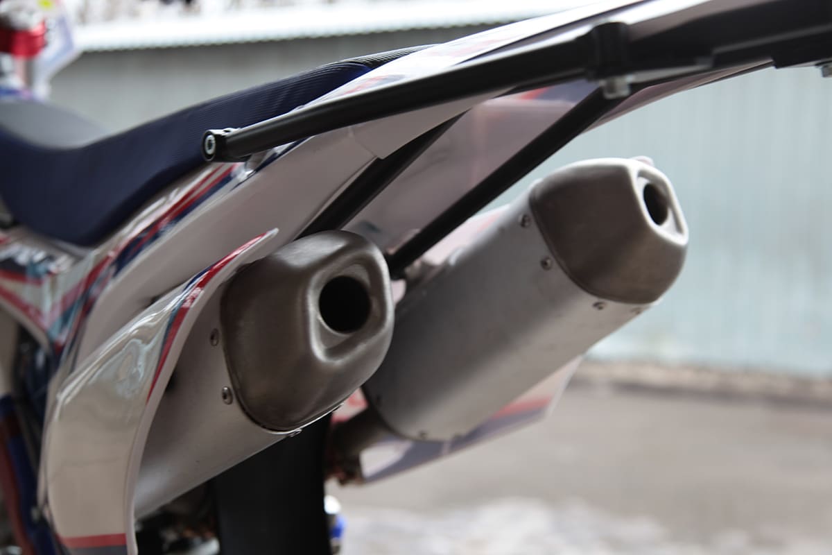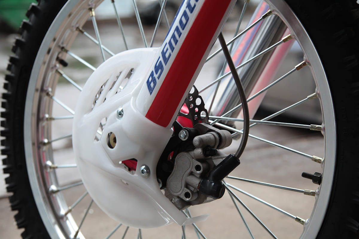 На мотоцикле установлено все необходимое для оффроуда: вилка “перевертыш”, литые рычаги задней прогрессии, алюминиевый маятник, прочный задний бугель, “злая” внедорожная резина Kenda. А также: усиленные легкосплавные колёсные диски MOJO, усиленная цепь, защита рук, датчик моточасов, прочные анодированные CNC ступицы, складные СNC рычаги тормоза и сцепления, колесные подшипники NTN, защита коллектора, днища и тормозных дисков. Комплектуется одинарным либо двойным глушителем. Мощная гидравлическая тормозная система HSК Racing остановит байк в любых условиях.