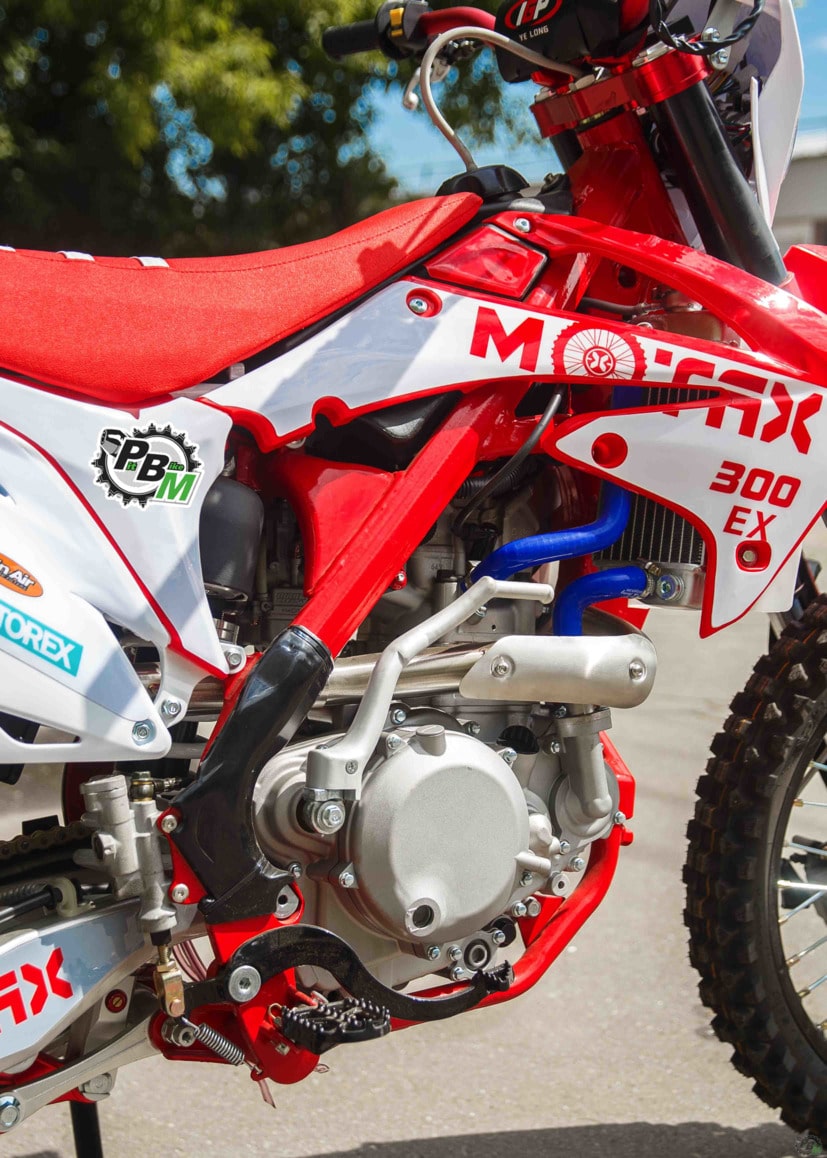 В этом сезоне Motax представил множество моделей кросс и эндуро мотоциклов. И вот одна из новинок, перед вами — MOTAX EX 300. Он позволит вам реализовать все ваши желания и потребности в экстримальной езде. Яркий и запоминающийся облик, сочетание синего и белого цвета. Рама кроссового мотоцикла MOTAX EX 300 выполнена из хромолибденового сплава, окрашена она в черный цвет. Просчитанная геометрия рамы, позволит разместиться комфортно райдеру ростом от 165 см. Двигатель одноцилиндровый, четырехтактный Zongshen 177 FMM (NC300), 299 см. куб. с водяным охлаждением (крутящий момент 25 Нм при 7000 об./мин.). Коробка механическая шести ступенчатая.