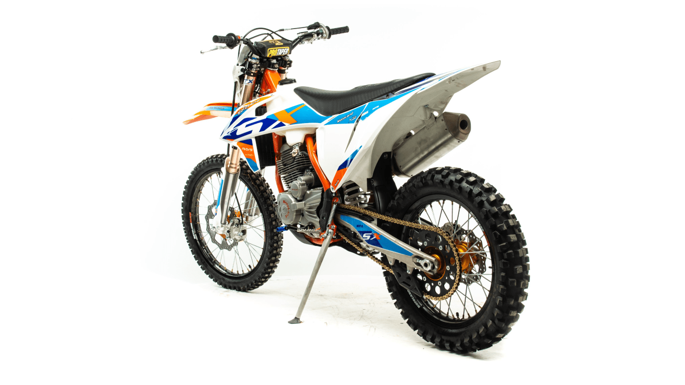 Колеса диаметром 21/18 идеально подходят для езды по бездорожью, а также по мягкому и средней жесткости грунту. Подвеска GPX позволяет с легкостью преодолевать ухабы, ямы и другие неровности. Мотоцикл оснащен LCD- приборной панелью, прямоточным глушителем, механической пятиступенчатой коробкой передач и двигателем ZONGSHEN 172FMM-3А мощностью 21 лошадиная сила, который способен развивать скорость до 120км/ч. За счет формы, дизайна и цвета пластика SX250 модель внешне похожа на мотоциклы марки KTM.