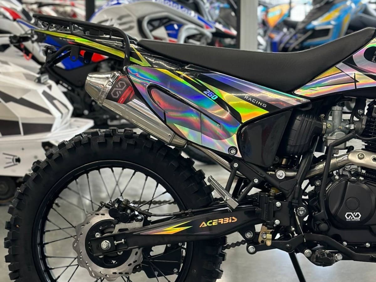 Передняя покрышка имеет размер 80/100-21, а задняя — 120/100-18. Они отлично справляются с песчаными и грязевыми условиями, что позволяет владельцу по максимуму проявить свои навыки на сложных маршрутах.