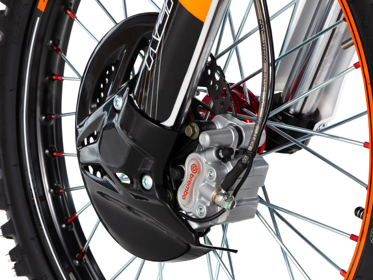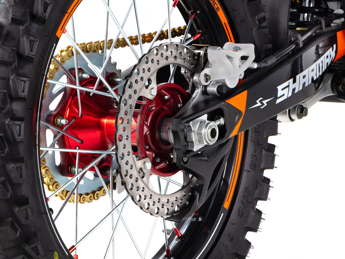 Подвеску Sharmax PowerMax 280 PR можно настроить под грязь, камни и песок без потери качества. Передняя вилка фирмы KKE имеет регулировки сжатия и отбоя, задняя (KKE) — справится с любыми преградами, от камней до деревьев. Байк легко настроить под свой вес, подобрав идеальный баланс жёсткости.