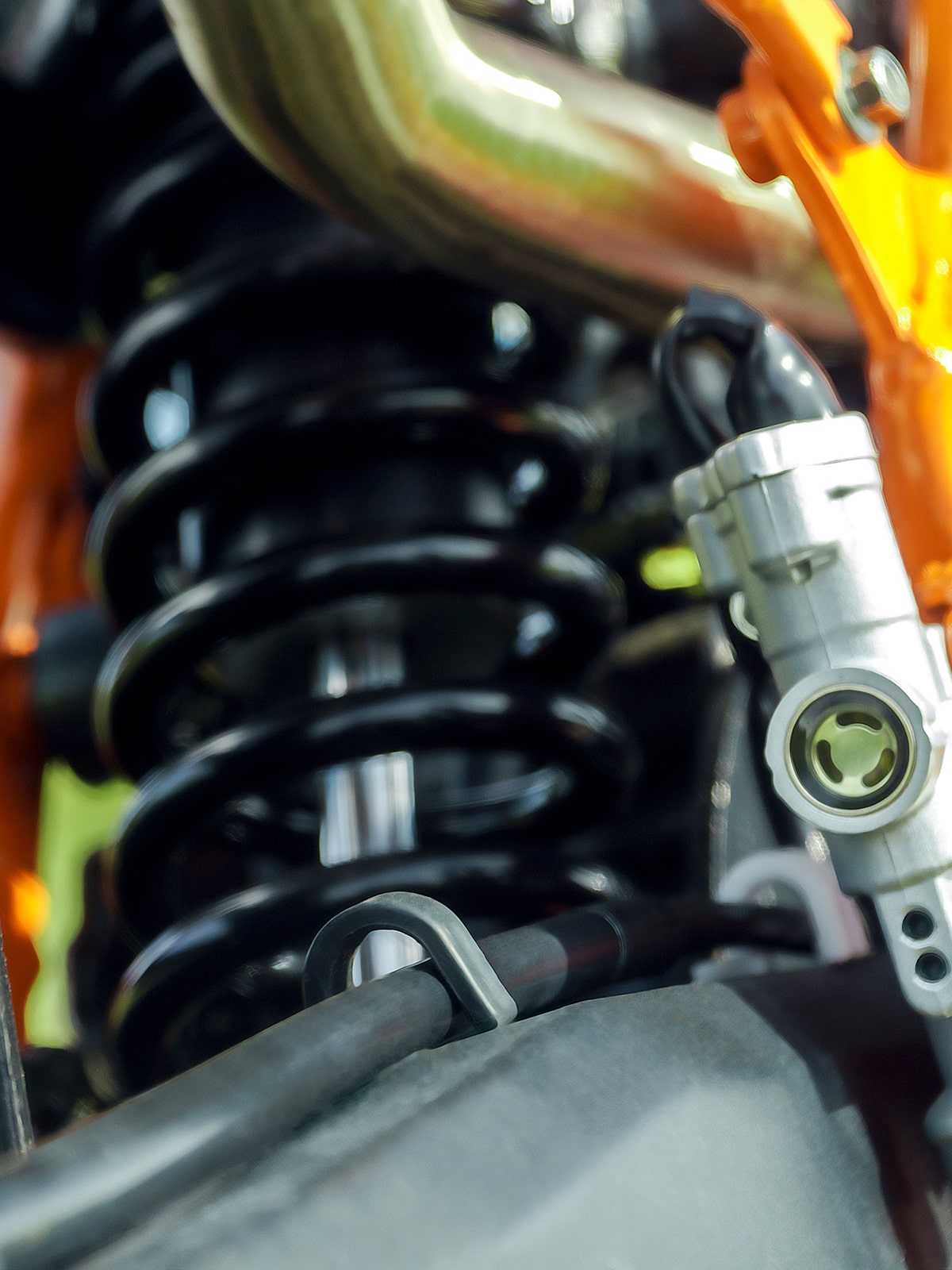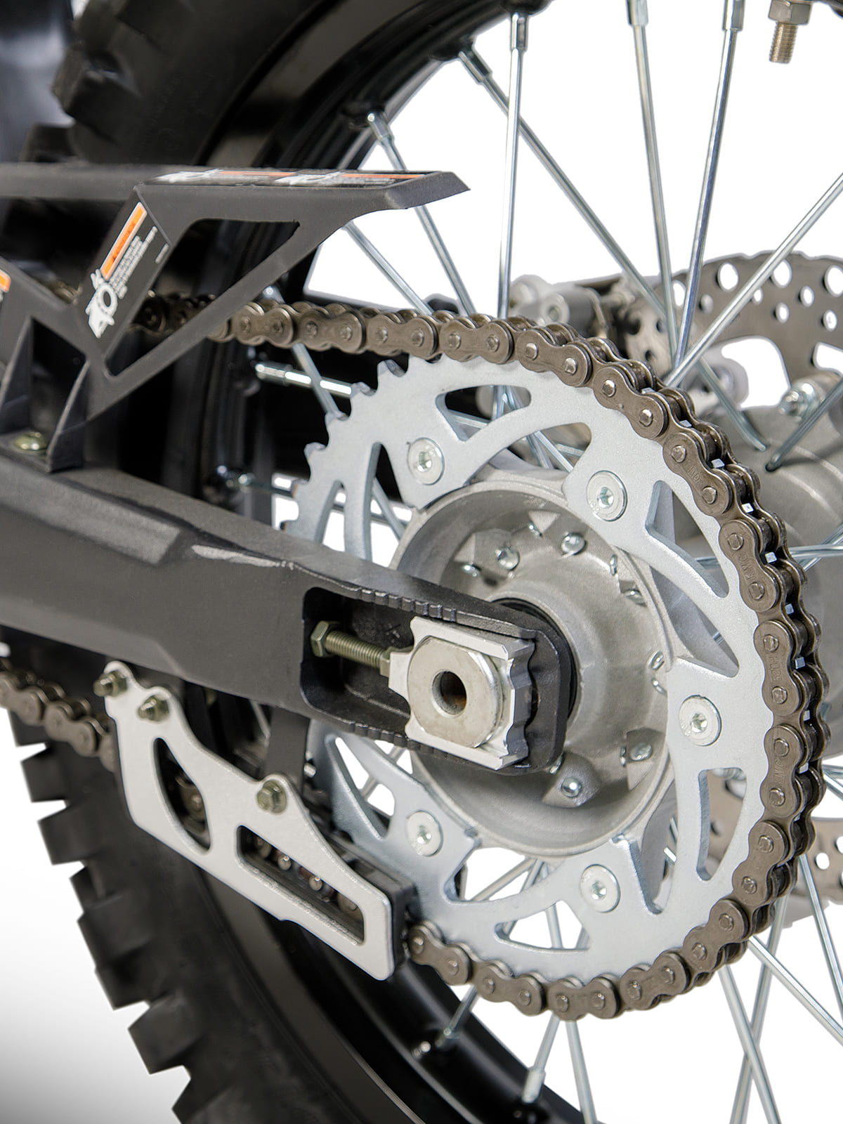 Подвеску Sharmax Powermax 250 можно настроить под грязь, камни и песок без потери качества. Передняя вилка фирмы KKE имеет регулировки сжатия и отбоя, задняя (KKE) — справится с любыми преградами, от камней до деревьев. Байк легко настроить под свой вес, подобрав идеальный баланс жёсткости.