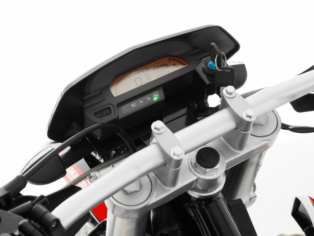 Управление байком всегда под контролем благодаря эргономичному рулю переменного сечения из ударостойкого и прочного алюминиевого сплава 7015. Мягкие силиконовые грипсы руля, короткоходная ручка газа, легкий выжим сцепления, фара с регулировкой наклона и LED-лампой. Все эти опции позволят комфортно использовать байк как в любительских, так и в серьёзных эндуро и кросс выездах. Благодаря колесам из высокопрочного алюминия 7116 с нержавеющими спицами и фрезерованными ступицами, можно преодолевать каменистые препятствия, не опасаясь повреждения обода.