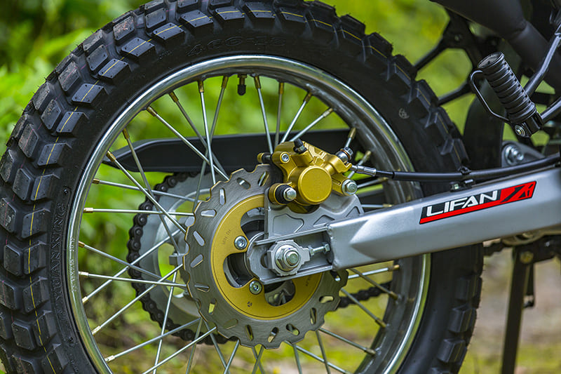 Передние шины диаметром 21 дюйм и задние 18-дюймовые шины толщиной 120 мм.