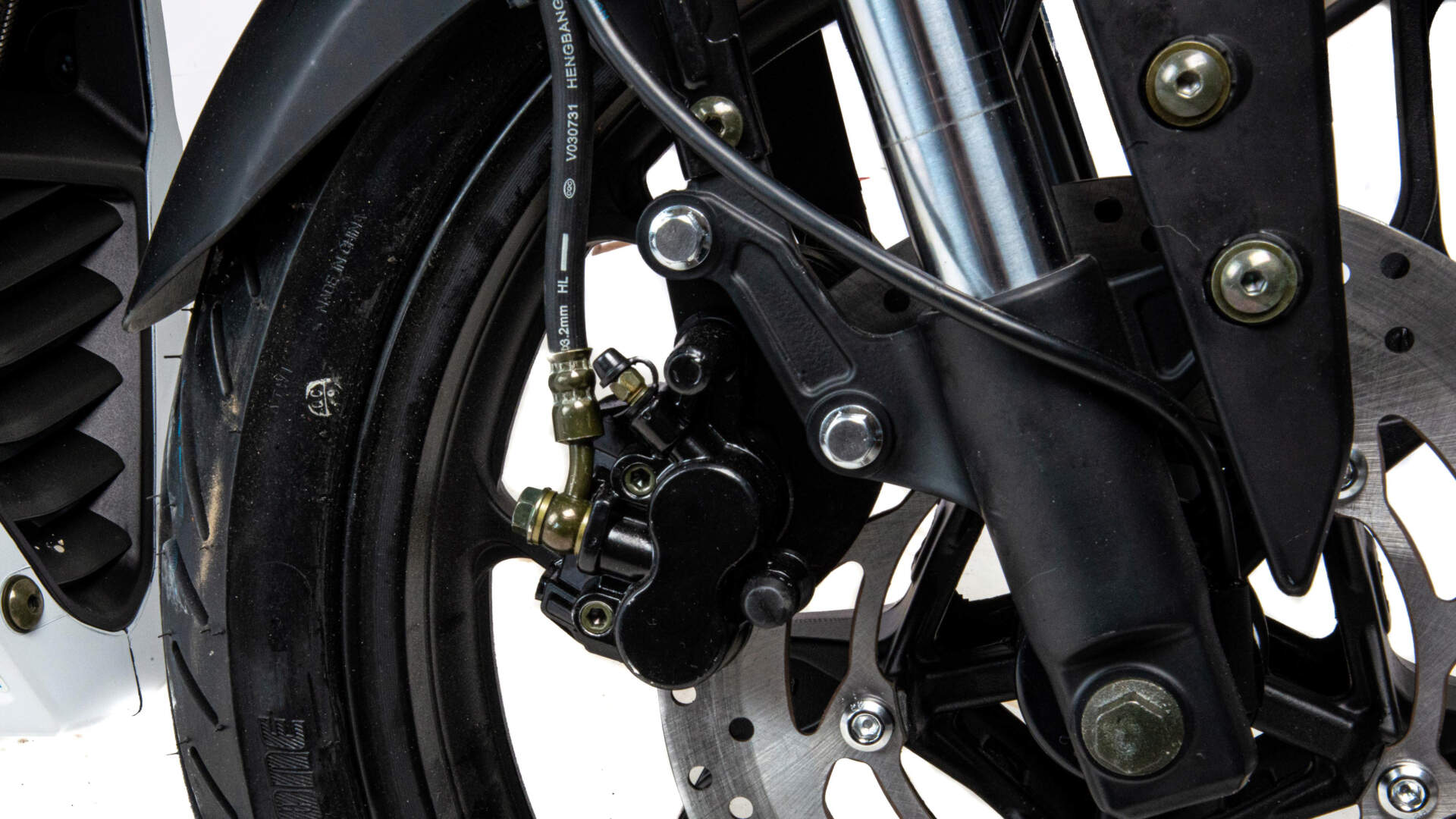 Также на новинке установлены двухпоршневые передние тормоза, литые алюминиевые обода , передняя вилка перевёрнутого типа с большим ходом, которая обеспечивает отличную управляемось для комфортного передвижения, как по городу, так и по бездорожью.