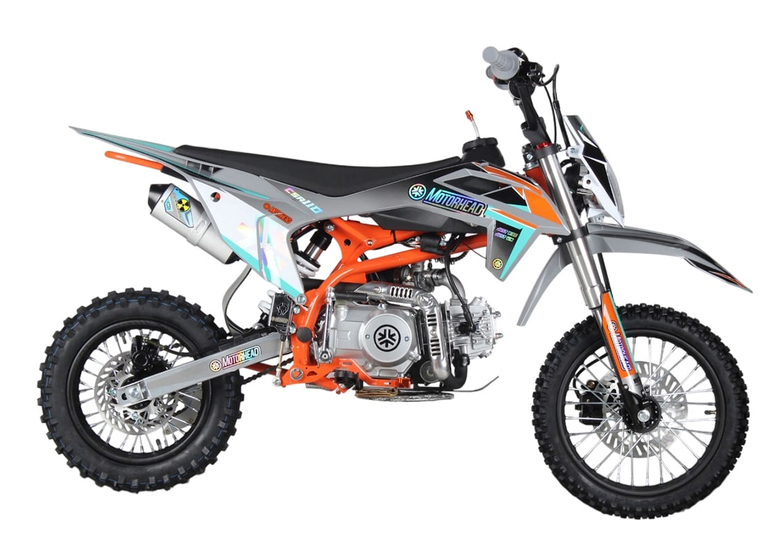MOTORHEAD CM110 14/12 — питбайк с мотором 110 см³ и механической коробкой передач. Лёгкий и надёжный, рассчитан на детей и подростков. Воздушное охлаждение обеспечивает простоту эксплуатации. Отличается прочной рамой и дисковыми тормозами. Хороший вариант для обучения и тренировок.