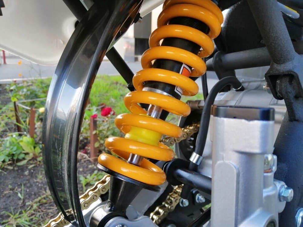 Подбор комплектующих свидетельствует о полной готовности питбайка к покорению бездорожья. Среди стоковых компонентов мини-мотоцикла стоит отметить: