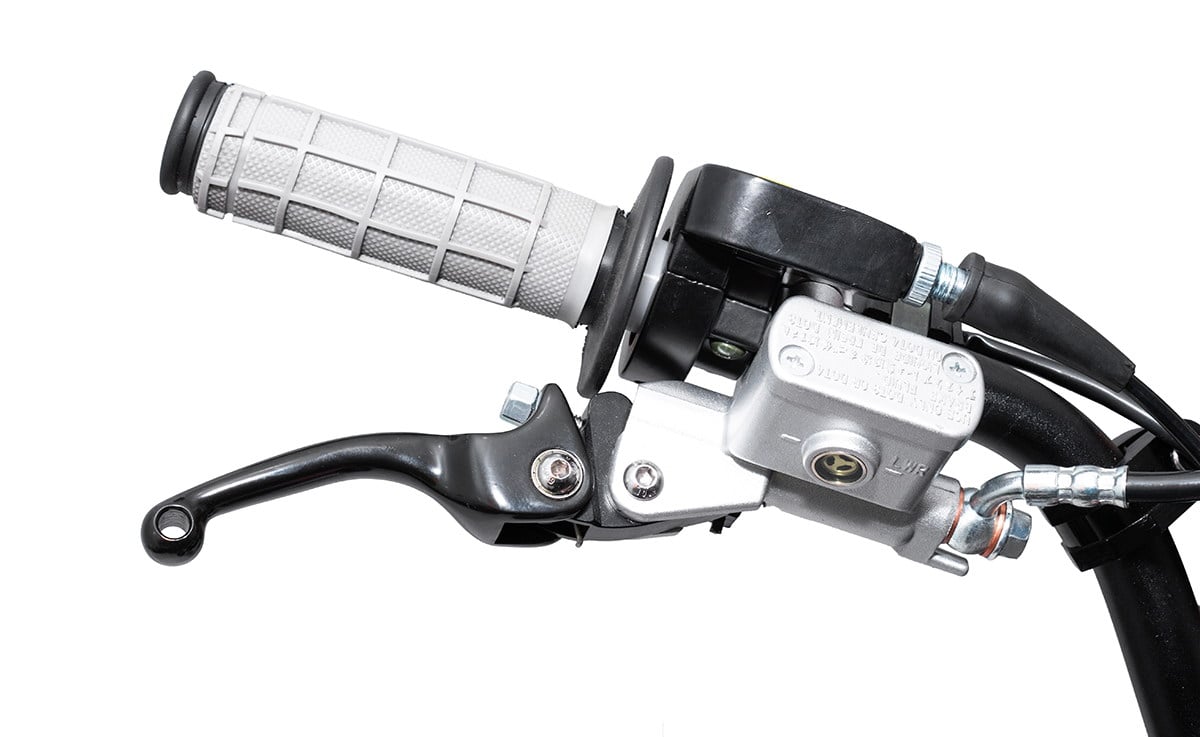 Колеса питбайка размером 17/14 дюймов с усиленными алюминиевыми ободьями на 36 спиц «обуты» в качественную кроссовую моторезину Kenda. Установленные на колесах буксаторы предотвратят проворачивание покрышки и защитят камеры от возможных повреждений. Питбайк комплектуется фарой головного света; она включается при помощи поворота ключа в замке зажигания. В качестве элементов защитного обвеса используются пластиковые обтекатели типа CRF.
