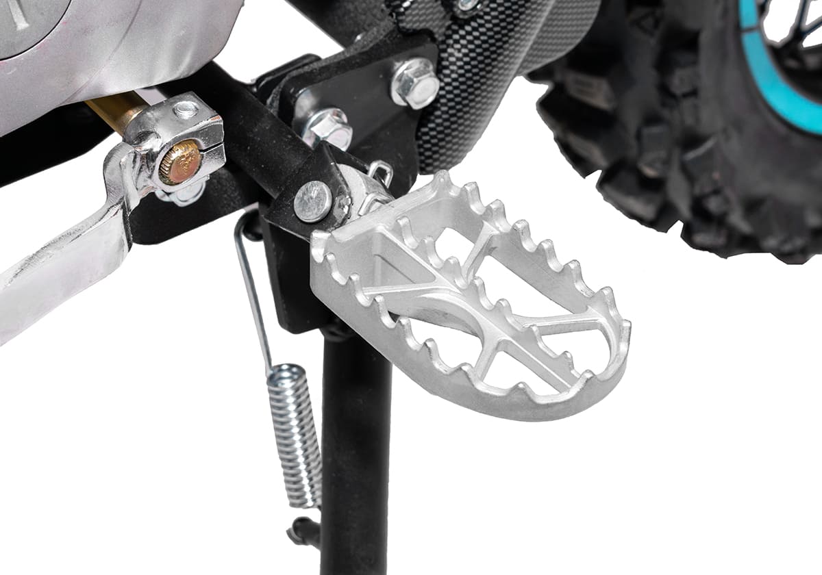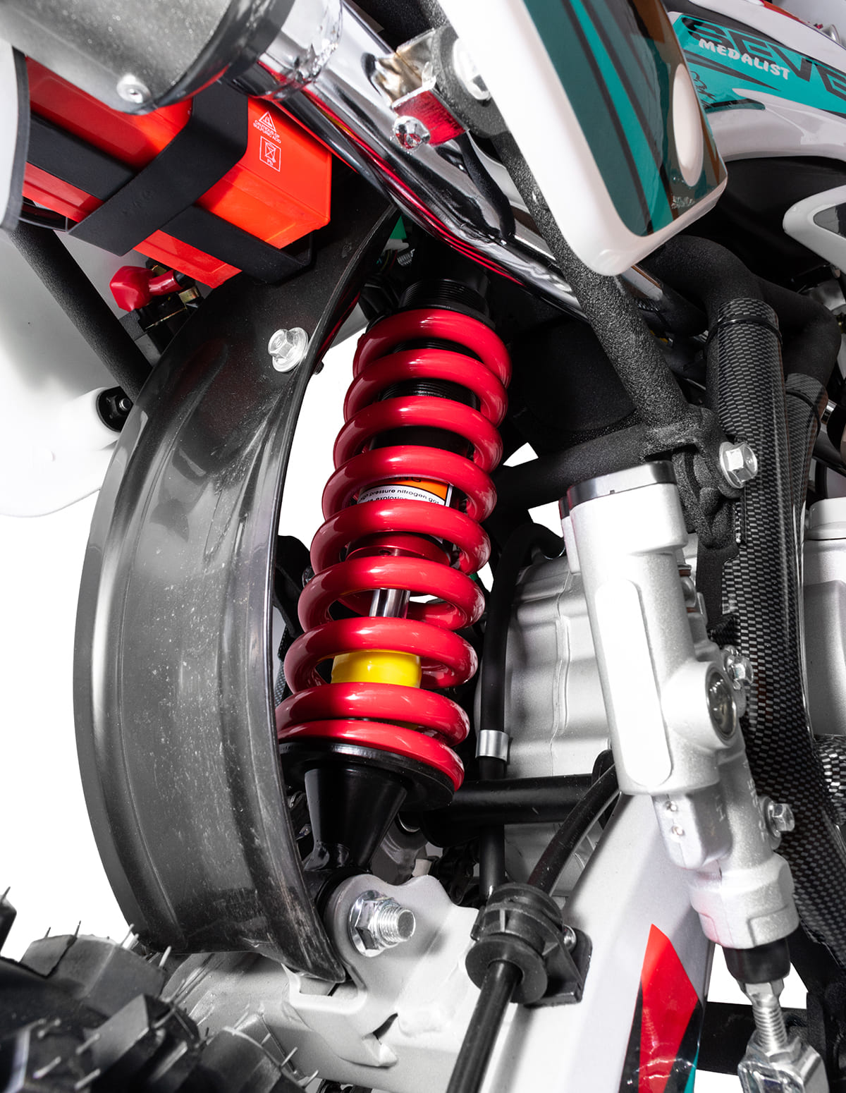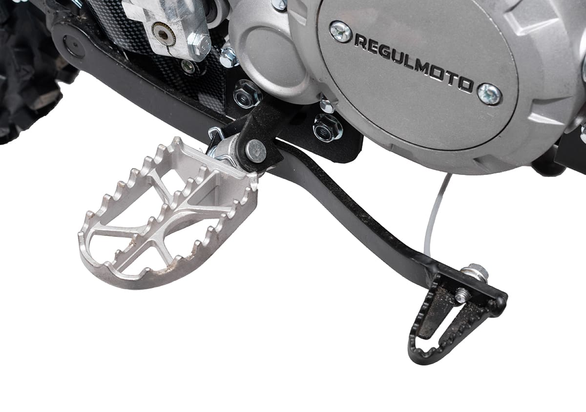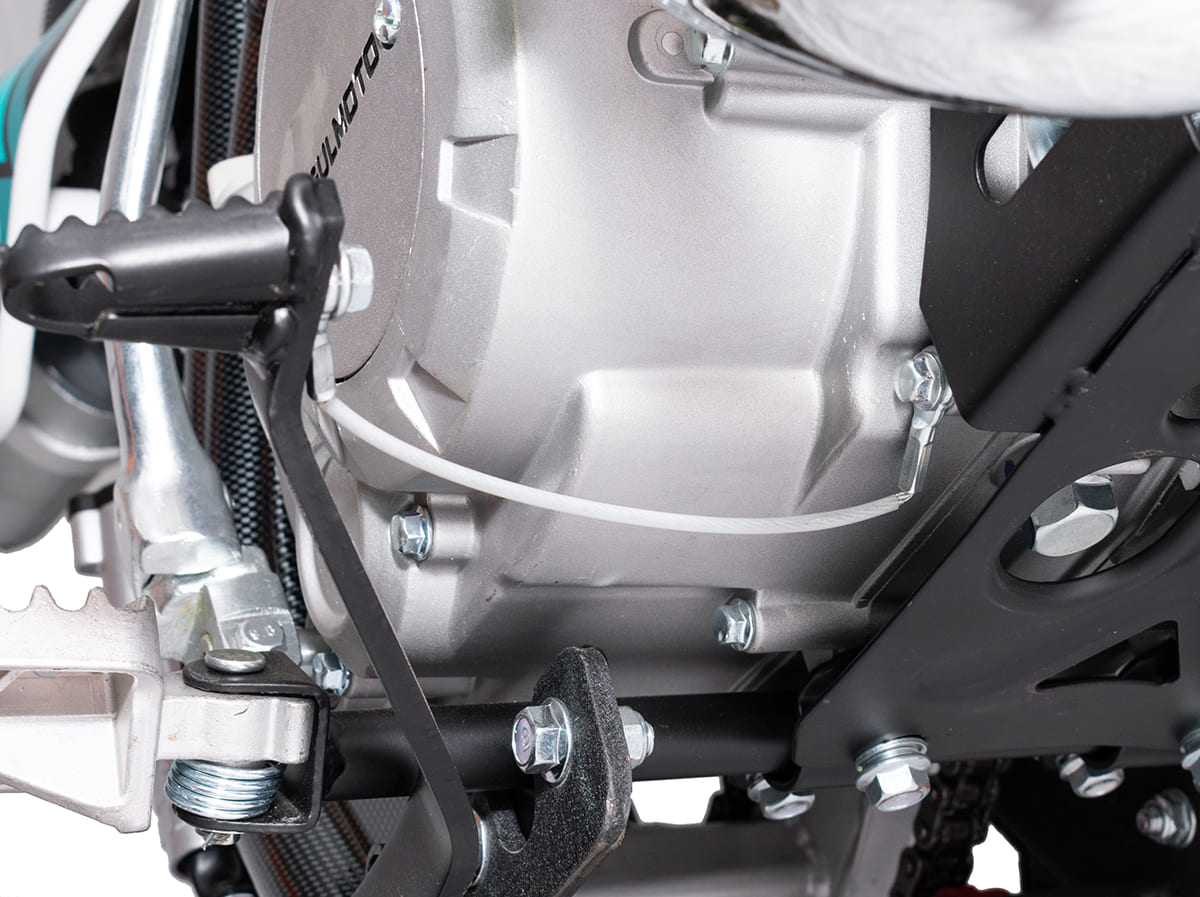 Двигатель YX c электростартером и механической 4-х ступенчатой коробкой передач. Масляный радиатор охлаждения CNC черного цвета. Карбюратор Nibbi PE19 Сальниковая, усиленная 428 цепь Усиленные алюминиевые колесные диски размерностью 17/14 с 36-ю спицами и буксаторами на оба колеса. Покрышки c увеличенными грунтозацепами. Высокий толстостенный алюминиевый руль ProTaper EVO с перемычкой. Увеличенный бензобак объёмом 7л. Рама покрыта защитным составом «Raptor» с защитными накладками. Амортизаторы KKE. Складные, регулируемые рычаги тормоза и сцепления IGP Racing Короткоходная ручка газа. Непромокаемое бесшовное покрытие сиденья «Valle Racing super grip» Рычаг заднего тормоза с «Кусторезом». Усиленные подножки водителя с увеличенным зацепами для мотобот. LED Лампа фары Сальниковая, усиленная 428 цепь Двухкомпонентные грипсы серо/черного цвета. Счётчик моточасов.
