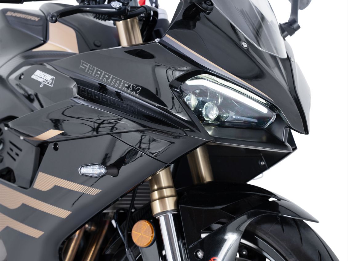 Футуристичный мотоцикл Sharmax GP 601 придётся по душе тем, кто любит выделяться из толпы. Яркий дизайн, в сочетании с мощным двигателем, не оставят равнодушными любителей драйва и адреналина. Благодаря классической спортивной посадке этот мотоцикл перенесёт райдера на гоночный трек и поможет погрузиться в атмосферу бескомпромиссной борьбы.