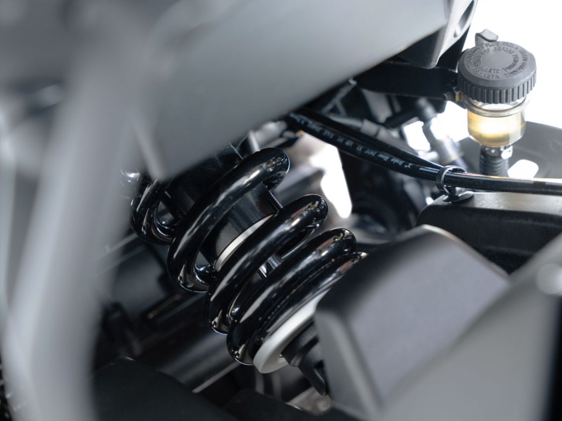 Спереди — телескопическая вилка сохраняет оптимальный баланс между комфортом и управляемостью. Два задних амортизатора имеют регулировку предварительного натяга пружины и помогают поддерживать высокий уровень комфорта.