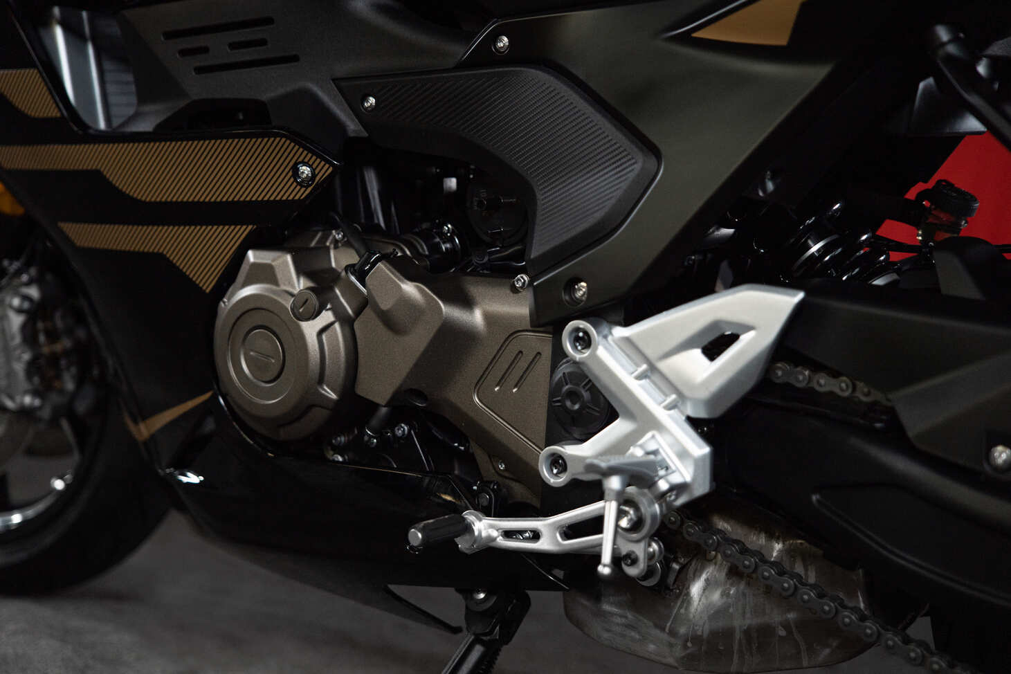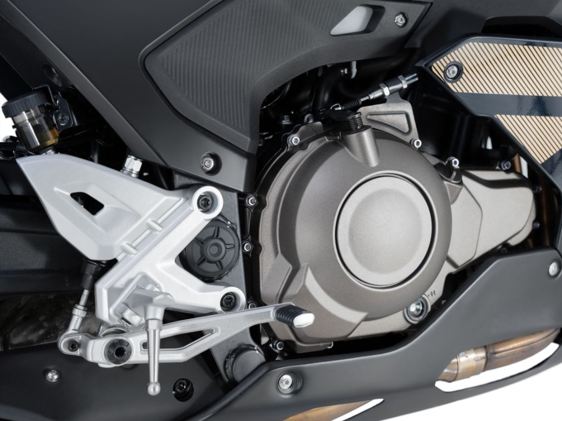 Двухцилиндровый двигатель объёмом 554 куб. см с жидкостным охлаждением, развивает мощность 61 л. с. при 8500 об/мин. Этот силовой агрегат отлично покажет себя в дальних поездках и порадует пользователей быстрым набором скорости.