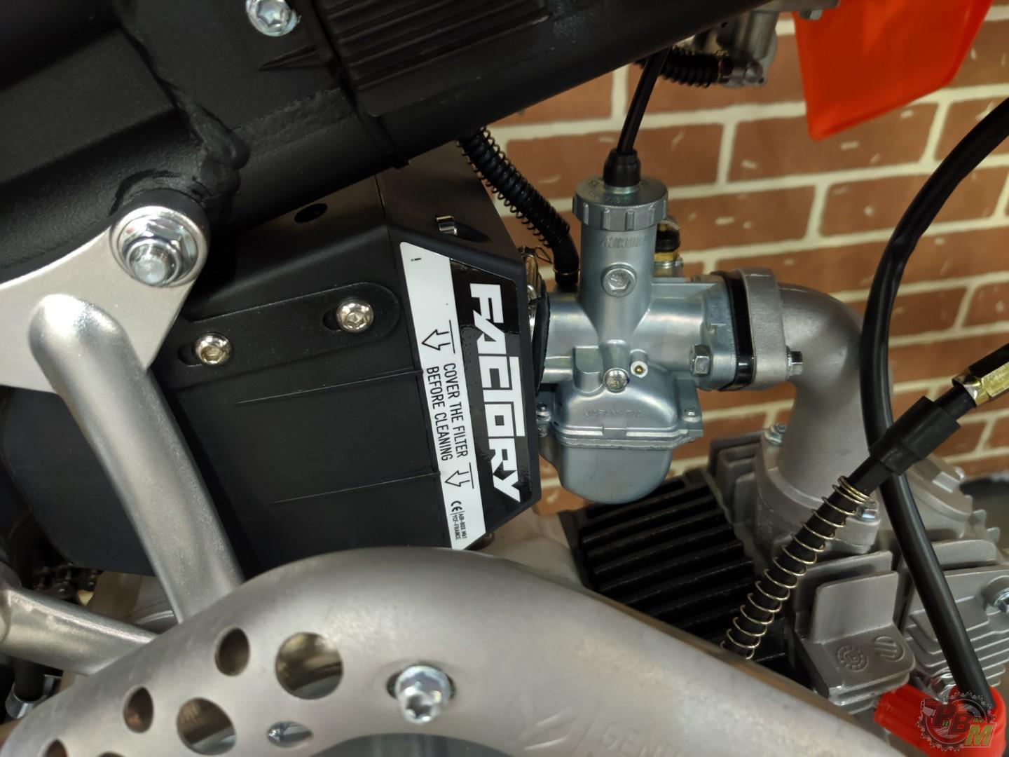 В проверенной надежной раме питбайка установлен 4-тактный двигатель рабочим объемом 125см3 с 4-ступенчатой трансмиссией, работающий в паре с карбюратором Mikuni VM22. Запуск мотора осуществляется при помощи кнопки электростартера или традиционным способом, рычагом кик-стартера.