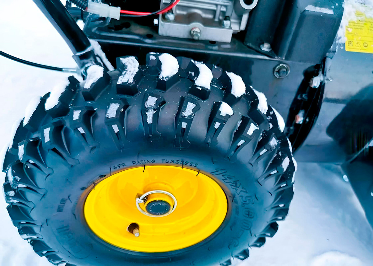 — Колеса. Снегоуборщик оснащен колесами, которые имеют отличное сцепление с поверхностью и могут проходить не только по наклону, но и по скользкой дороге.
