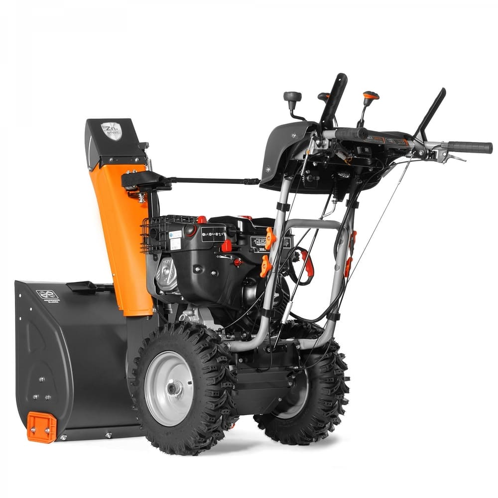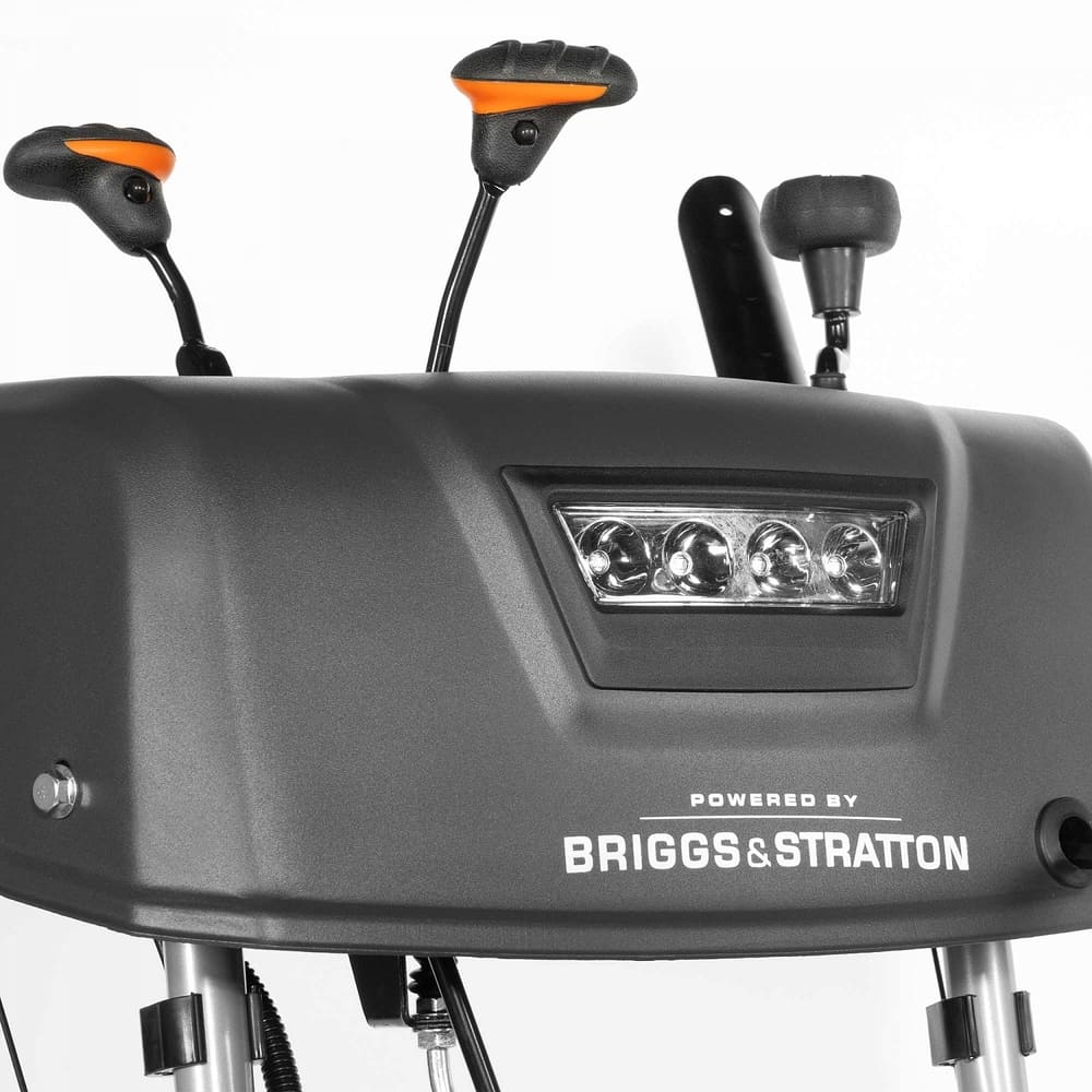 Снегоуборочная машина оснащена бензиновым двигателем Briggs&Stratton мощностью 10 л.с. и объемом 306 куб. см с воздушным охлаждением. Запуск мотора можно производить как с ручного стартера, так и с электростартера, максимальных оборотов двигатель достигает 3600.