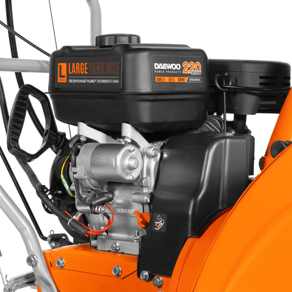 Снегоуборочная машина оснащена бензиновым двигателем DAEWOO 230 winter мощностью 8 л.с. и объемом 220 куб. см с воздушным охлаждением. Запуск мотора можно производить как с ручного стартера, так и с электростартера, максимальных оборотов двигатель достигает 3600.