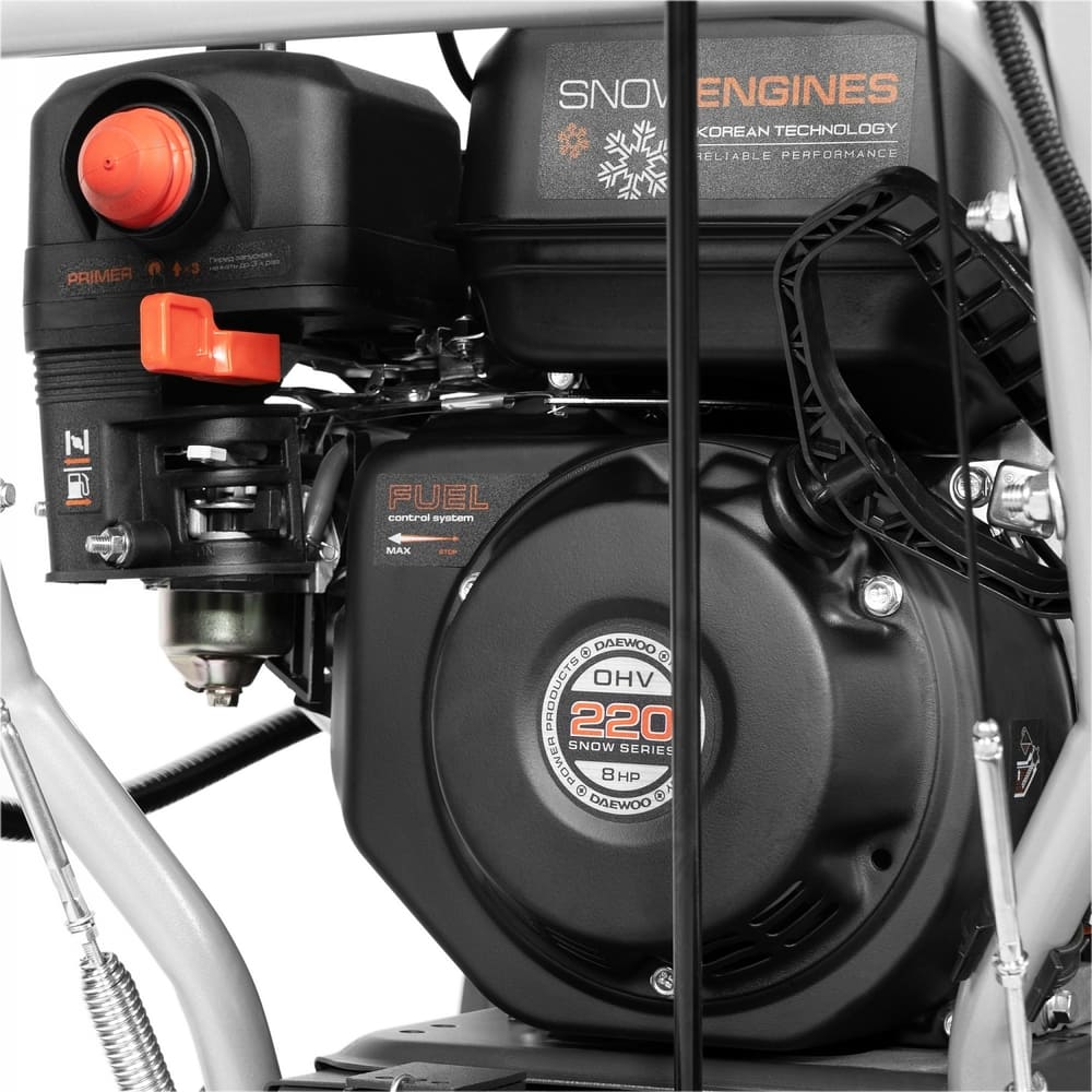 Снегоуборочная машина оснащена бензиновым двигателем мощностью 8 л.с. и объемом 220 куб. см с воздушным охлаждением. Запуск устройства происходит благодаря ручному стартеру, максимальных оборотов двигатель достигает 3600.