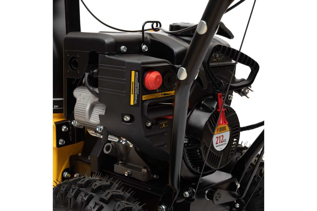 — Металлический желоб для выброса снега. Находится в удобном месте, позволяет перенаправлять выброс снега с помощью рычага.