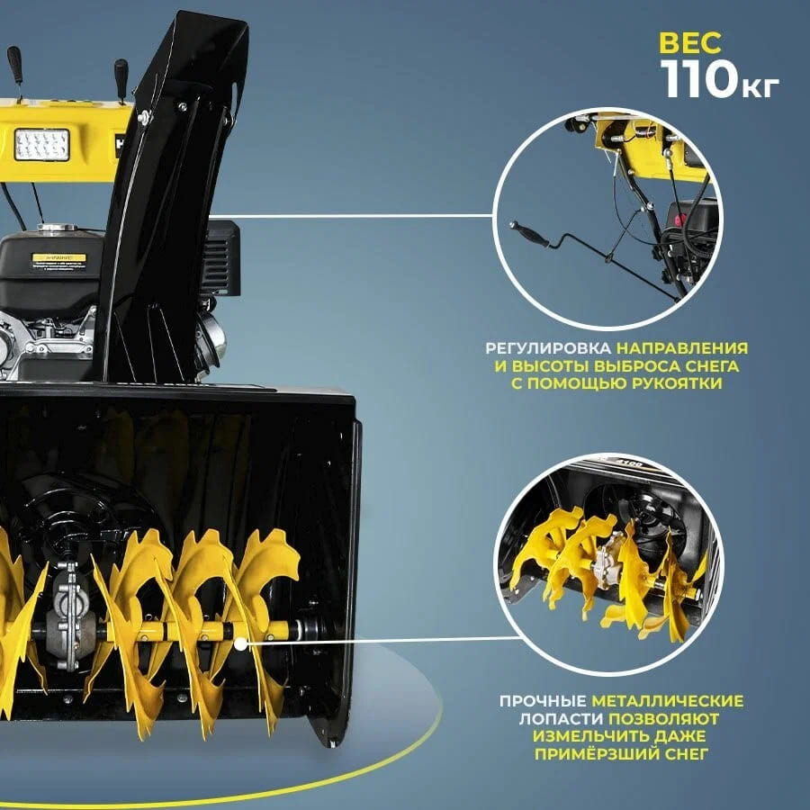 Эта модель снегоуборщика показывает высокую эффективность при уборке плотного и свежего снега. Она также оборудована специальными рычагами на панели управления для регулировки высоты и направления выброса снега. Основные преимущества данной модели: