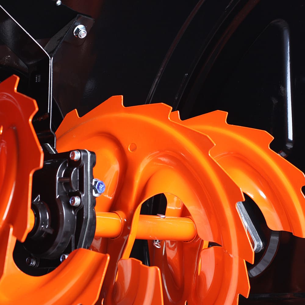 - Снег измельчается в крошку, и выбрасывается через металлический желоб. Желоб обладает устойчивостью к ударам и коррозии.