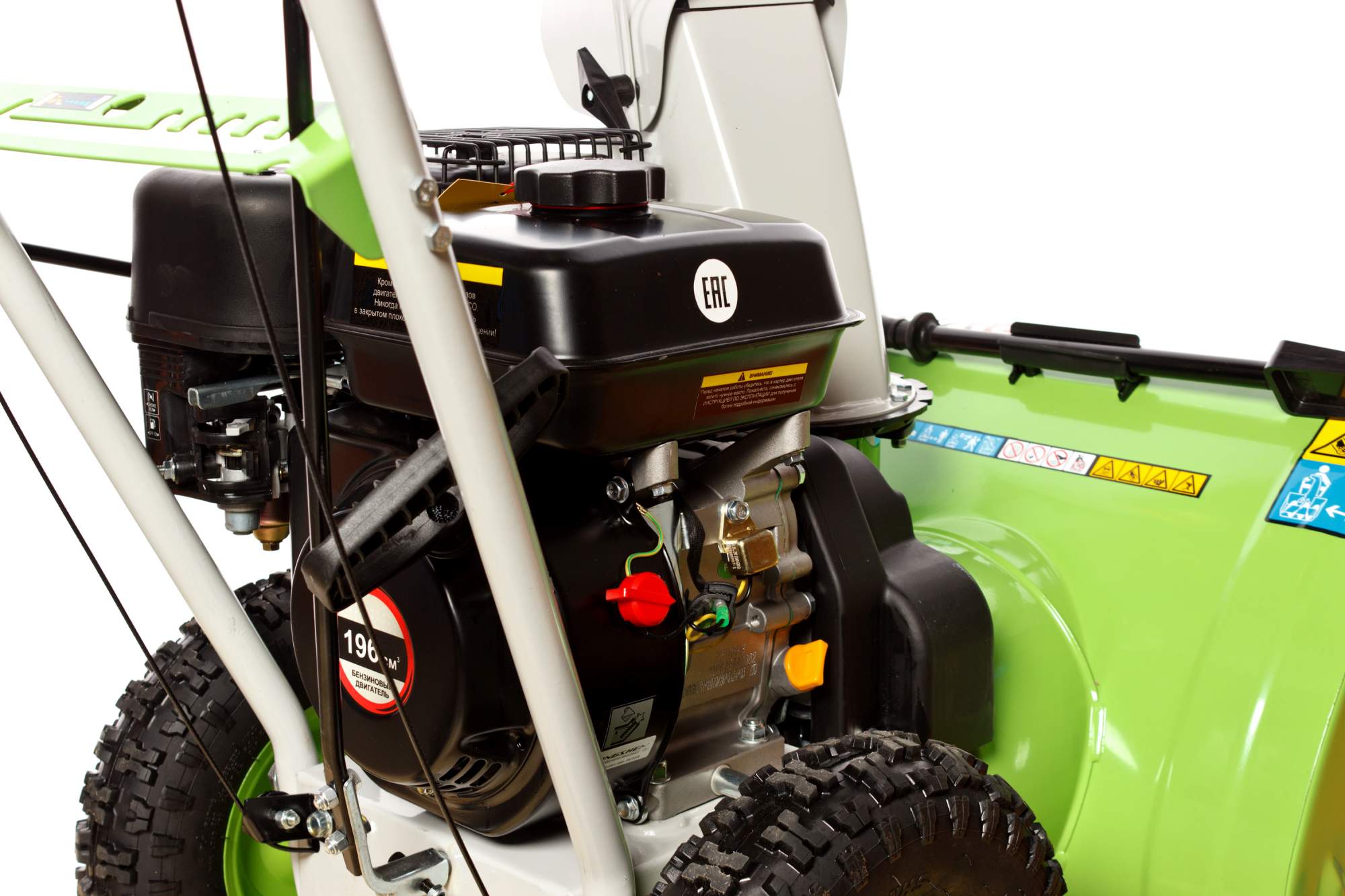- ● поворотный желоб выброса снега регулируется до 180 градусов с помощью дистанционной рукоятки;