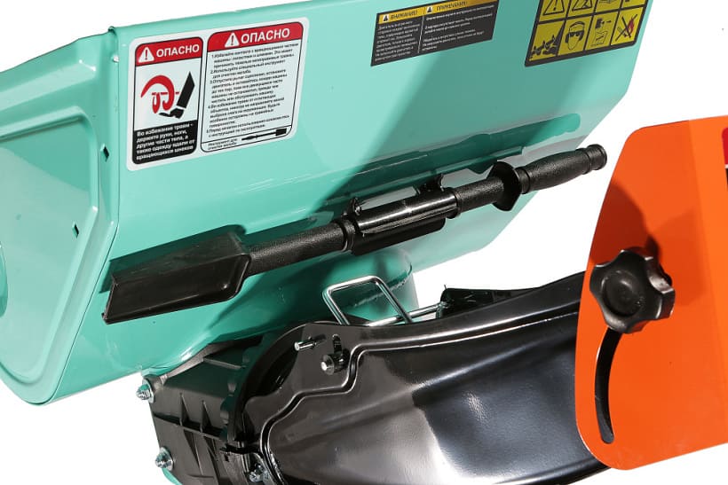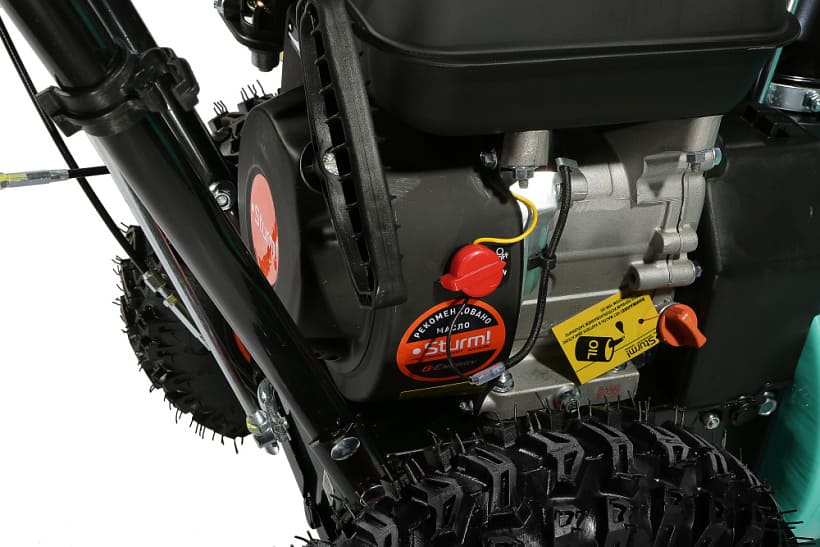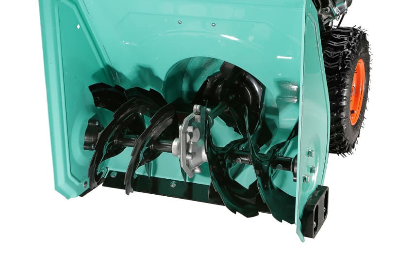 Высокая производительность машины обеспечивается не только мощным двигателем, но и продуманной конструкцией забора снега — этому способствует использование мощных агрессивных шнеков с большим профилем зуба, позволяющих легко справляться даже со слежавшимся снегом и настом, а также вместительного снегозагребного ковша, гарантирующего внушительную ширину прохода и возможность убирать сугробы до полуметра высотой. Снегоуборщик оснащен выпускным желобом, с регулировкой как по направлению, так и углу выброса, благодаря чему пользователь без труда может настроить оптимальное расстояние, на которое будет отбрасываться снежная масса. Максимальная дальность выброса достигает 11 метров. Для лучшего сцепления с поверхностью модель комплектуется специальными шинами с глубоким протектором.